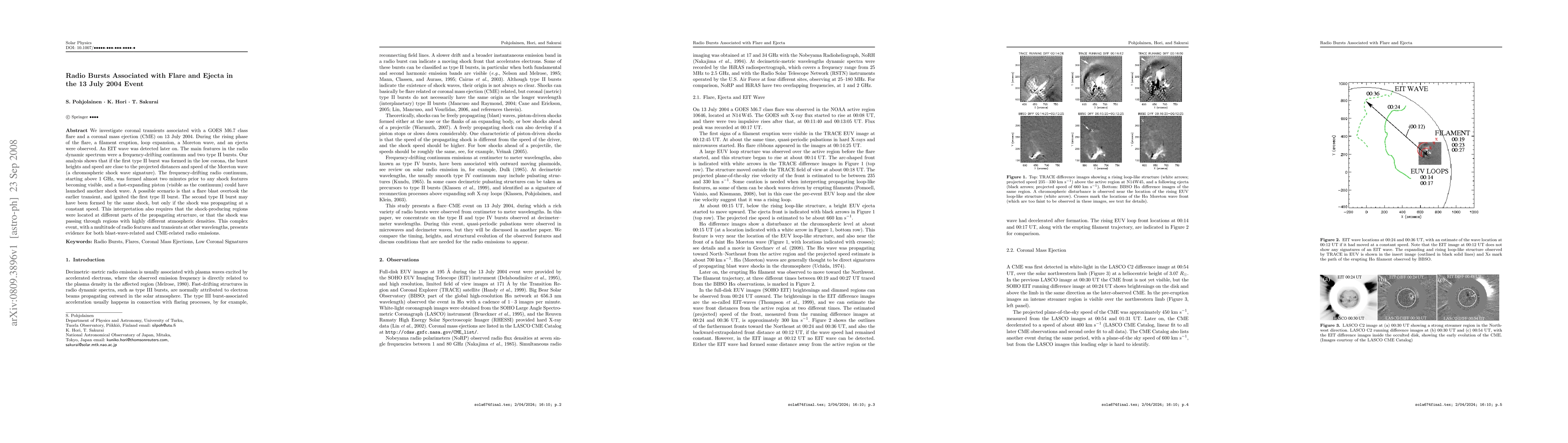 We investigate coronal transients associated with a GOES M6.7 class flare and a coronal mass ejection (CME) on 13 July 2004. During the rising phase of the flare, a filament eruption, loop expansion, a Moreton wave, and an ejecta were observed. An EIT wave was detected later on. The main features in the radio dynamic spectrum were a frequency-drifting continuum and two type II bursts. Our analysis shows that if the first type II burst was formed in the low corona, the burst heights and speed are close to the projected distances and speed of the Moreton wave (a chromospheric shock wave signature). The frequency-drifting radio continuum, starting above 1 GHz, was formed almost two minutes prior to any shock features becoming visible, and a fast-expanding piston (visible as the continuum) could have launched another shock wave. A possible scenario is that a flare blast overtook the earlier transient, and ignited the first type II burst. The second type II burst may have been formed by the same shock, but only if the shock was propagating at a constant speed. This interpretation also requires that the shock-producing regions were located at different parts of the propagating structure, or that the shock was passing through regions with highly different atmospheric densities. This complex event, with a multitude of radio features and transients at other wavelengths, presents evidence for both blast-wave-related and CME-related radio emissions.