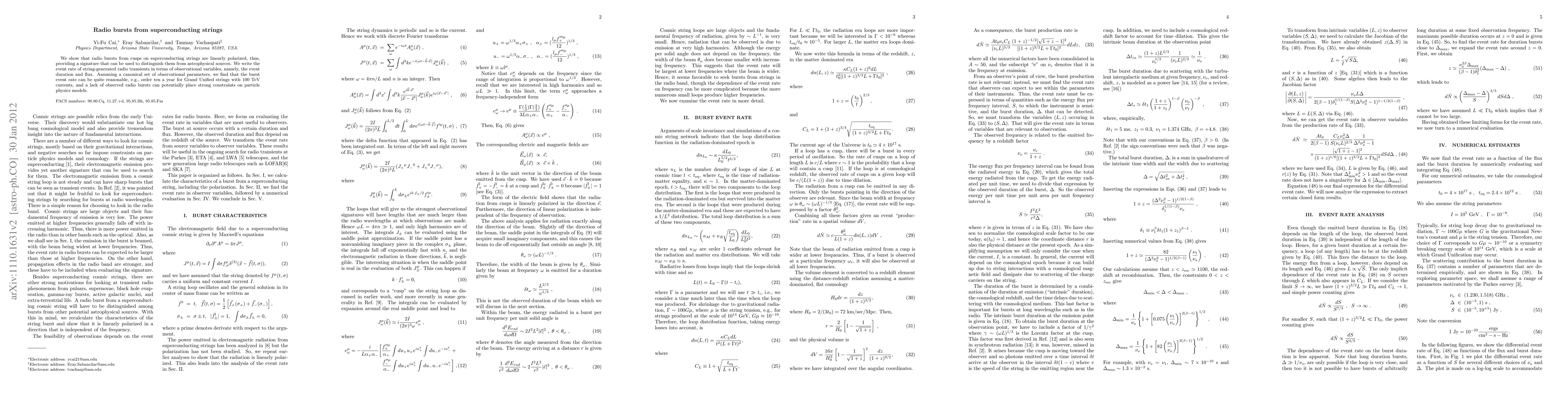 We show that radio bursts from cusps on superconducting strings are linearly polarized, thus, providing a signature that can be used to distinguish them from astrophysical sources. We write the event rate of string-generated radio transients in terms of observational variables, namely, the event duration and flux. Assuming a canonical set of observational parameters, we find that the burst event rate can be quite reasonable, e.g., order ten a year for Grand Unified strings with 100 TeV currents, and a lack of observed radio bursts can potentially place strong constraints on particle physics models.