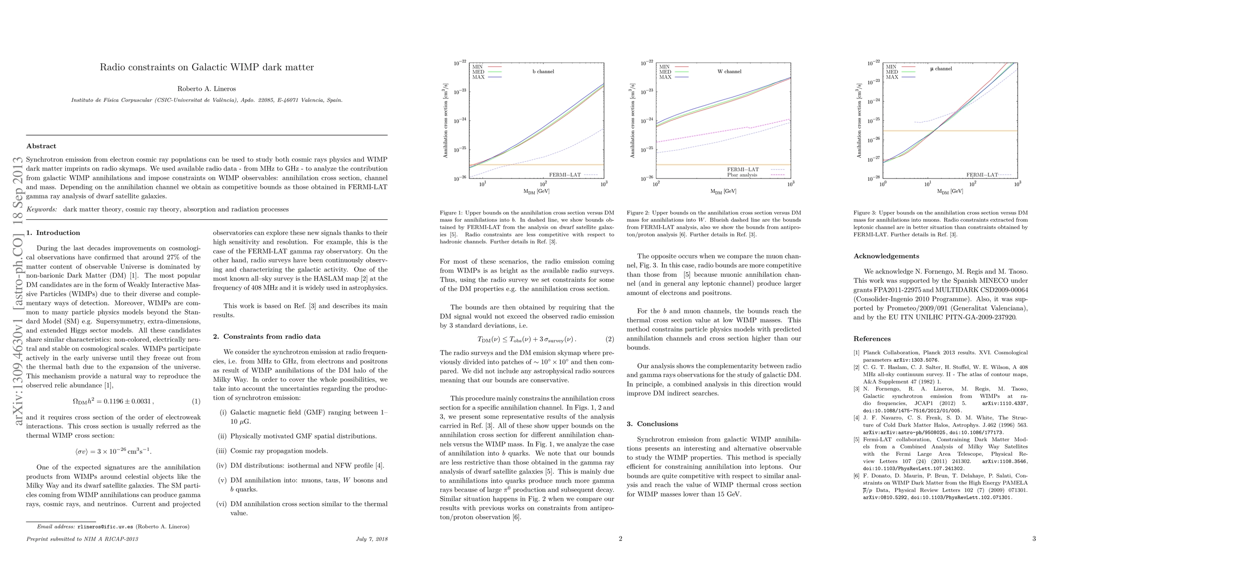 Synchrotron emission from electron cosmic ray populations can be used to study both cosmic rays physics and WIMP dark matter imprints on radio skymaps. We used available radio data - from MHz to GHz - to analyze the contribution from galactic WIMP annihilations and impose constraints on WIMP observables: annihilation cross section, channel and mass. Depending on the annihilation channel we obtain as competitive bounds as those obtained in FERMI-LAT gamma ray analysis of dwarf satellite galaxies.