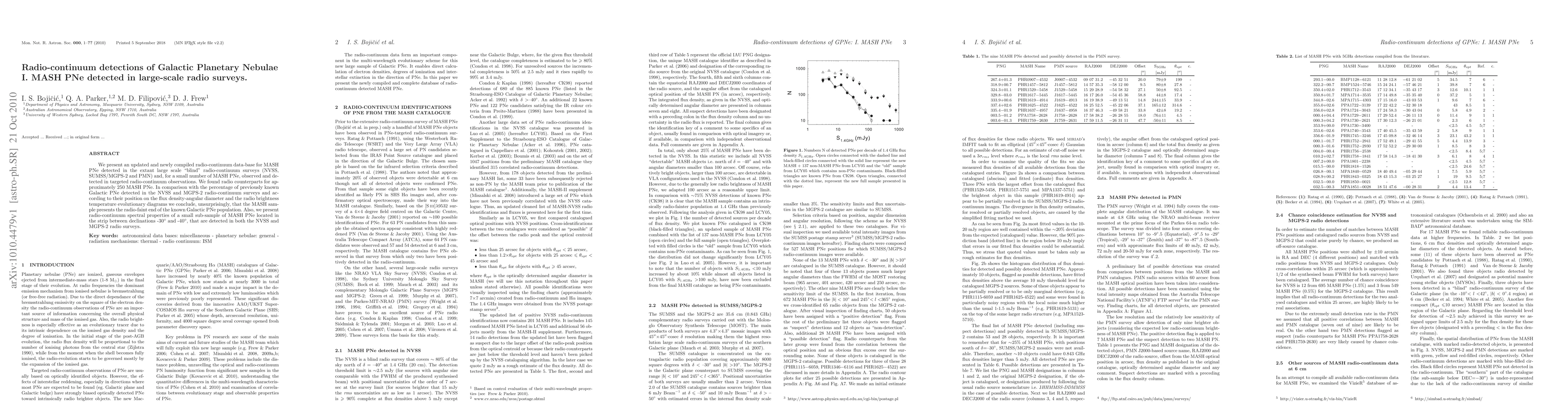 This paper compiles radio-continuum data for 250 MASH Planetary Nebulae (PNe) detected in large-scale radio surveys, finding that they represent the radio-faint end of the known Galactic PNe population. Additionally, it examines the spectral properties of a sub-sample of these PNe detected in both NVSS and MGPS-2 surveys.