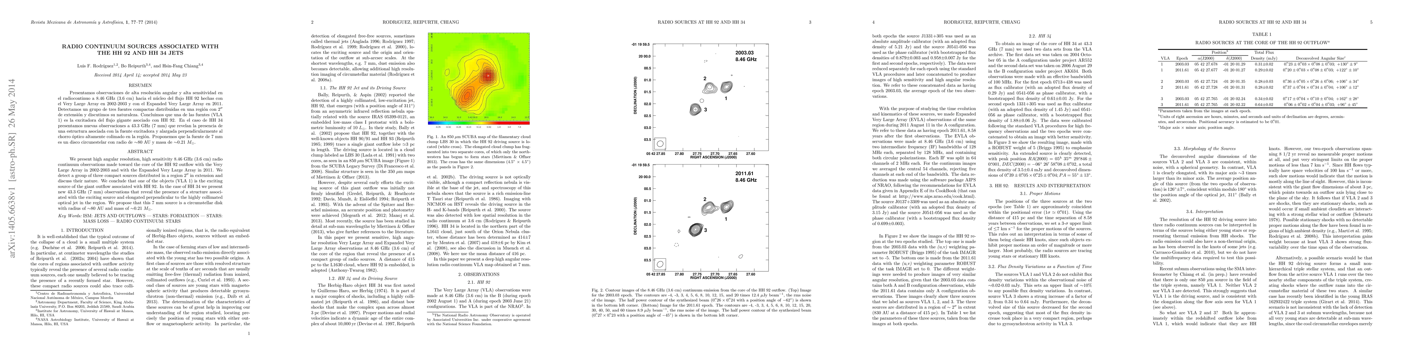 We present high angular resolution, high sensitivity 8.46 GHz (3.6 cm) radio continuum observations made toward the core of the HH~92 outflow with the Very Large Array in 2002-2003 and with the Expanded Very Large Array in 2011. We detect a group of three compact sources distributed in a region 2$''$ in extension and discuss their nature. We conclude that one of the objects (VLA 1) is the exciting source of the giant outflow associated with HH~92. In the case of HH~34 we present new 43.3 GHz (7 mm) observations that reveal the presence of a structure associated with the exciting source and elongated perpendicular to the highly collimated optical jet in the region. We propose that this 7 mm source is a circumstellar disk with radius of $\sim$80 AU and mass of $\sim$0.21 $M_\odot$.