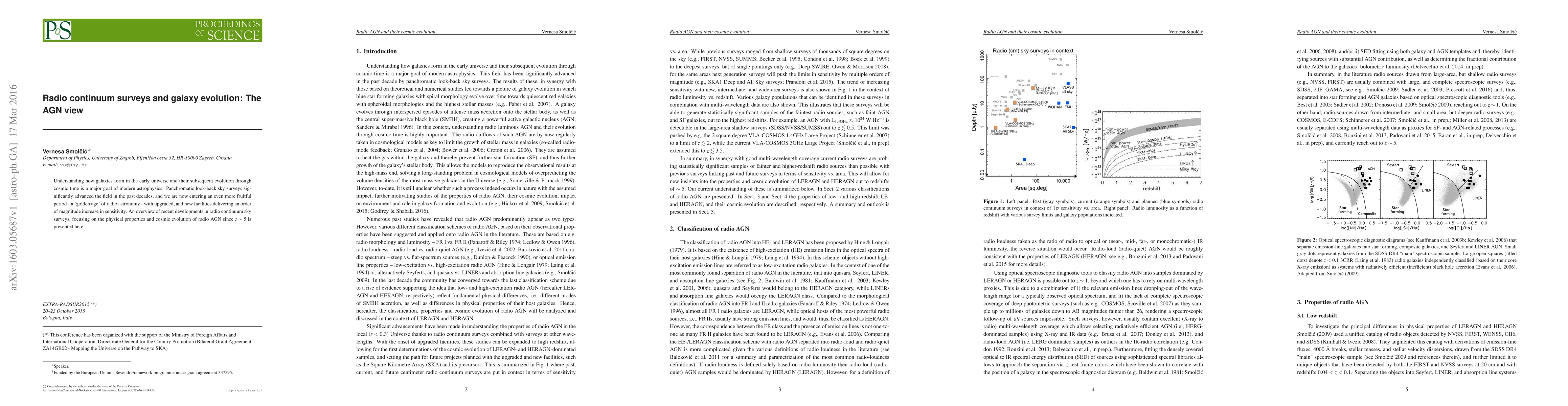 Understanding how galaxies form in the early universe and their subsequent evolution through cosmic time is a major goal of modern astrophysics. Panchromatic look-back sky surveys significantly advanced the field in the past decades, and we are now entering an even more fruitful period - a 'golden age' of radio astronomy - with upgraded, and new facilities delivering an order of magnitude increase in sensitivity. An overview of recent developments in radio continuum sky surveys, focusing on the physical properties and cosmic evolution of radio AGN since z~5 is presented here.