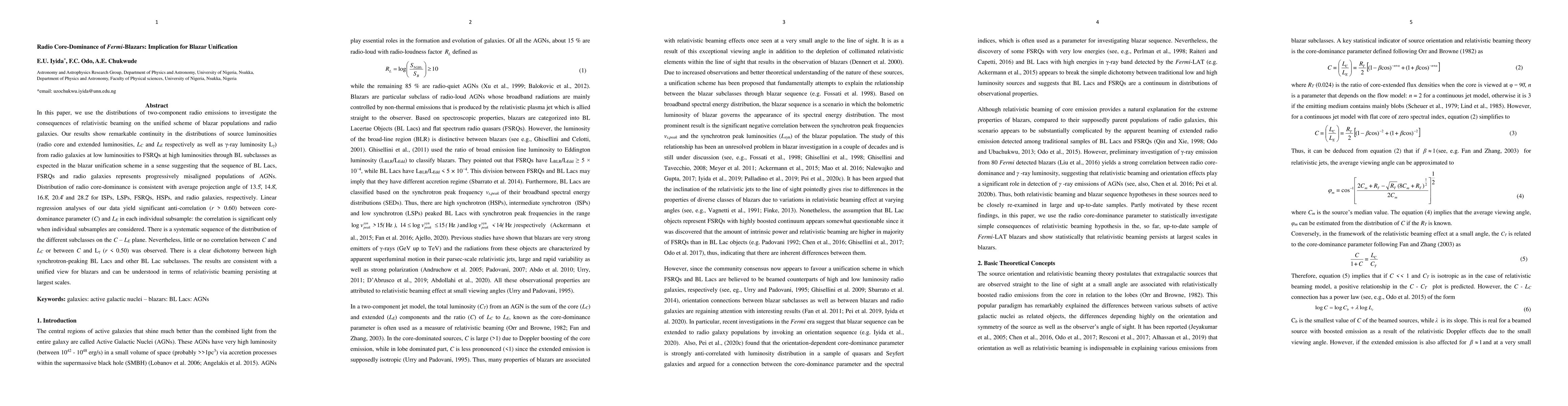 ...The distribution of radio core-dominance is consistent with average projection angles of 13.5, 14.8, 16.8, 20.4, and 28.2 for ISPs, LSPs, FSRQs, HSPs, and radio galaxies, respectively. Linear regression analyses of our data yield significant anti-correlation r greater than 0.60 between core-dominance parameter and extended luminosity in each individual subsample, the correlation is significant only when individual subsamples are considered. There is a systematic sequence of the distribution of the different subclasses on the Core-dominance parameter-extended luminosity plane. Nevertheless, little or no correlation between Core-dominance parameter and core luminosity or between Core dominance parameter and gamma-ray luminosity r, less than 0.50 was observed. There is a clear dichotomy between high synchrotron-peaking BL Lacs and other BL Lac subclasses. The results are consistent with a unified view for blazars and can be understood in terms of relativistic beaming persisting at the largest scales.