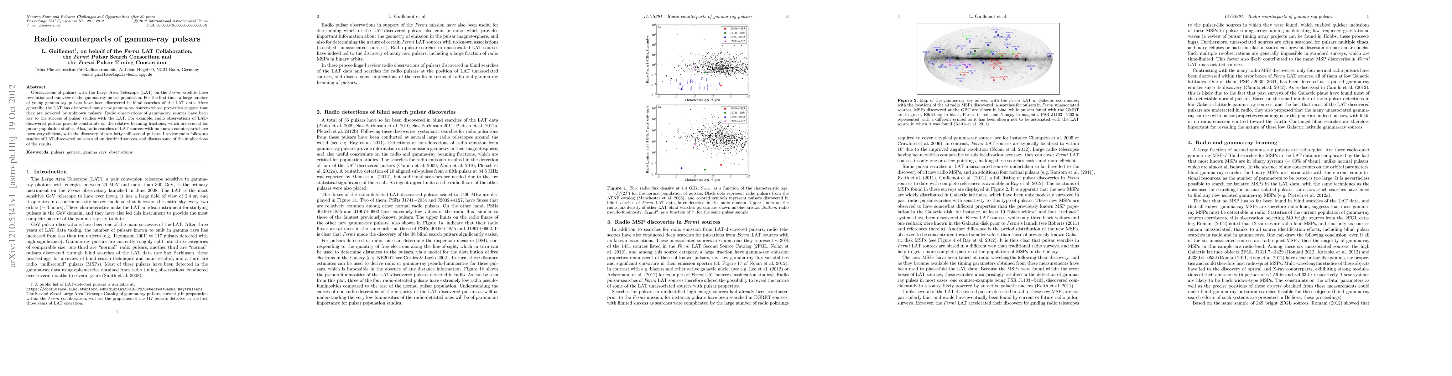 This paper reviews radio observations that have followed the discovery of gamma-ray pulsars and unidentified sources by the Fermi satellite's Large Area Telescope (LAT). These radio follow-ups have been crucial in identifying pulsars, constraining their beaming fractions, and discovering over forty millisecond pulsars.