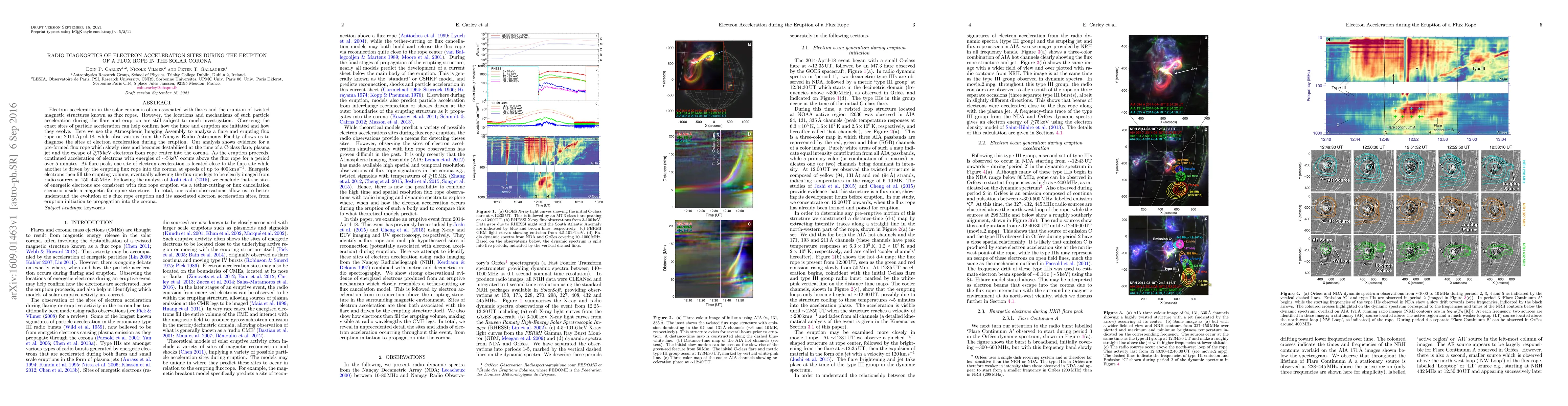 This study uses radio diagnostics to identify electron acceleration sites during the eruption of a flux rope in the solar corona, revealing two distinct acceleration regions: one near the flare site and another driven by the erupting flux rope. The analysis provides insights into the initiation and evolution of solar flares and flux rope eruptions.