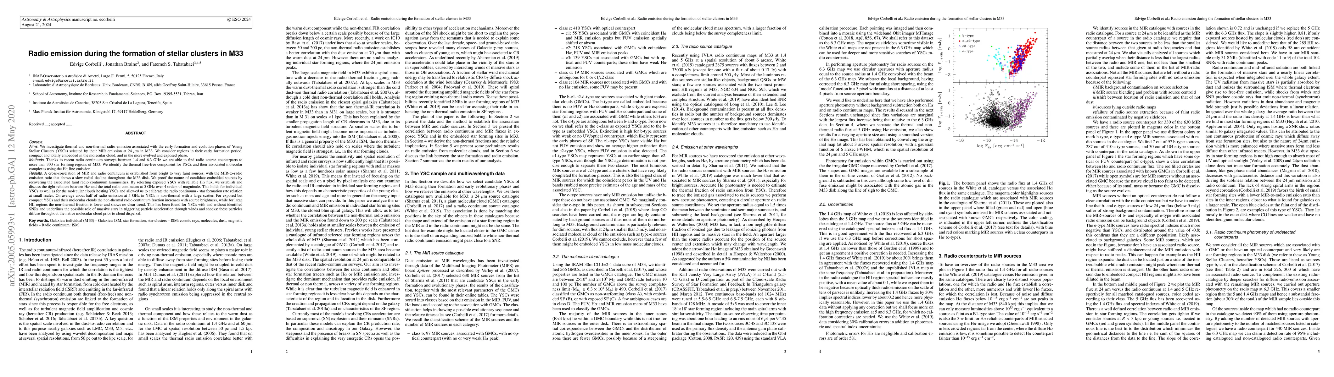 We investigate thermal and non-thermal radio continuum associated with the early formation and evolution of Young Stellar Clusters (YSCs) selected by their MIR emission in M33. For the first time in an external galaxy it has been possible to identify radio counterparts to more than 300 star forming regions. We proof the nature of candidate YSCs fully embedded in molecular clouds, by recovering their associated faint radio continuum luminosities. Using the Halpha line to identify free-free radio emission at 5 GHz in the more evolved, partially exposed YSCs, we retrieve information on the relevance of magnetic fields and cosmic rays across the M33 disk at 25 pc spatial scales. A cross-correlation of MIR and radio continuum luminosities is established from bright to very faint YSCs, with MIR-to-radio emission ratio showing a gradual decline towards the outer disk, while the magnetic field is pervasive at all radii. We establish and discuss the tight relation between radio continuum and other star formation indicators, such as Halpha. This relation holds for individual YSCs over four orders of magnitude as well as for molecular clouds hosting YSCs. On average about half of radio emission at 5 GHz in YSCs is non-thermal. For exposed but compact YSCs the non-thermal radio fraction increases with source brightness, while for large HII regions the fraction is lower and shows no clear trend. This has been found for YSCs with and without identified SNRs and underlines the possible role of massive stars in triggering particle acceleration through winds and shocks: these particles diffuse throughout the native molecular cloud prior to cloud dispersal.
