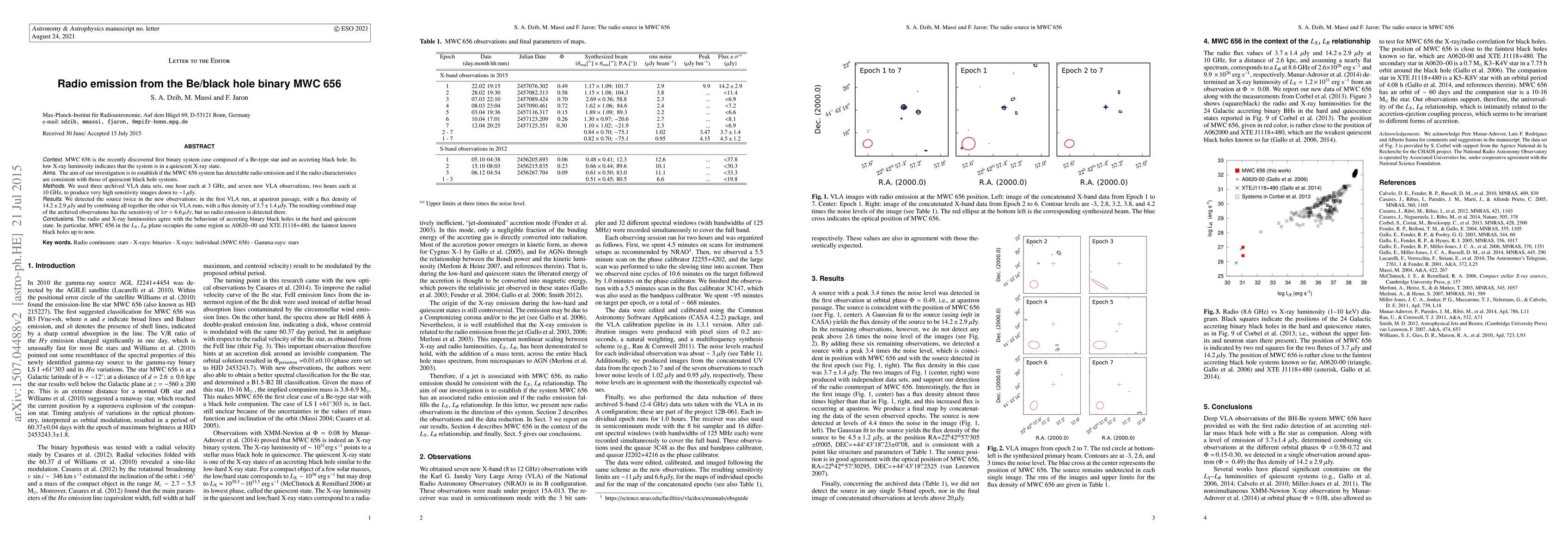 The study detected radio emission from the Be/black hole binary MWC 656 during new VLA observations, confirming its presence in quiescent states similar to other faint black hole systems. The detected radio flux densities align with the expected behavior of accreting black hole binaries.