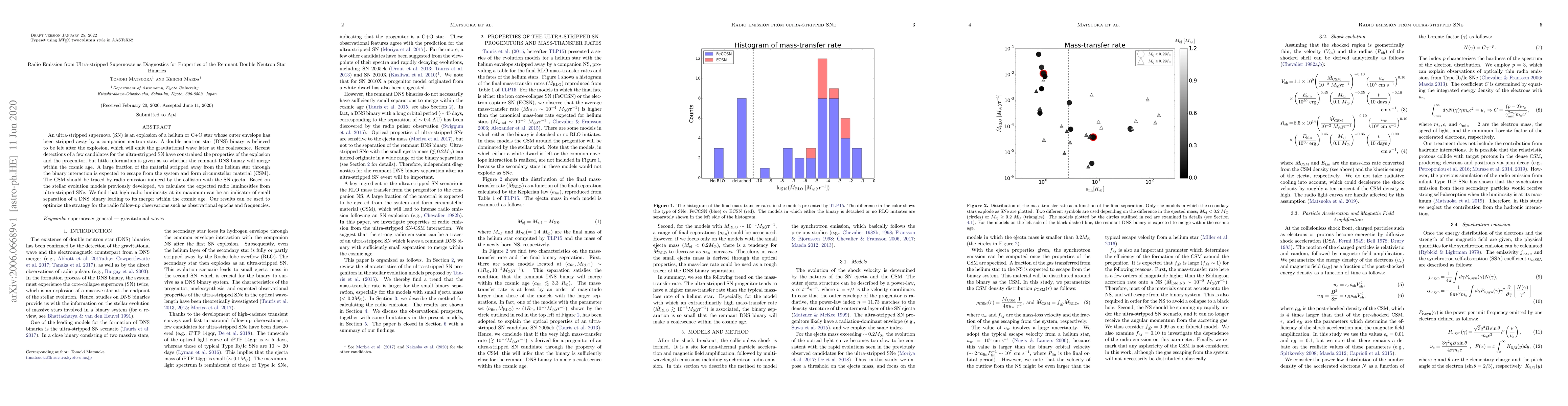 This paper investigates radio emissions from ultra-stripped supernovae to predict properties of remnant double neutron star binaries. High radio luminosity at the maximum indicates a small separation in the DNS binary, suggesting it may merge within the cosmic age.