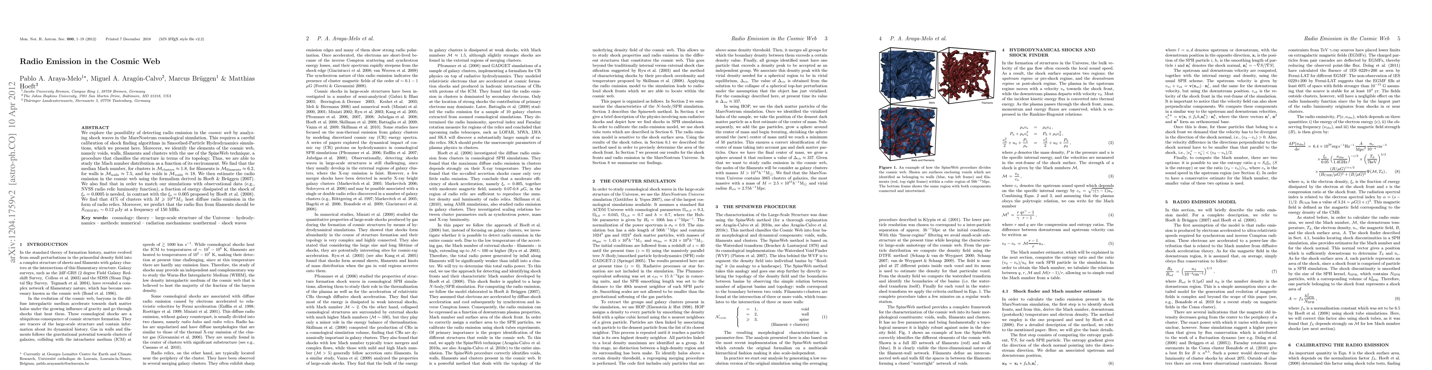 Researchers used simulations to study radio emission in the cosmic web, finding that clusters have a median Mach number of 1.8, while filaments have a median of 6.2, suggesting areas with high shock activity could be sources of radio emission.