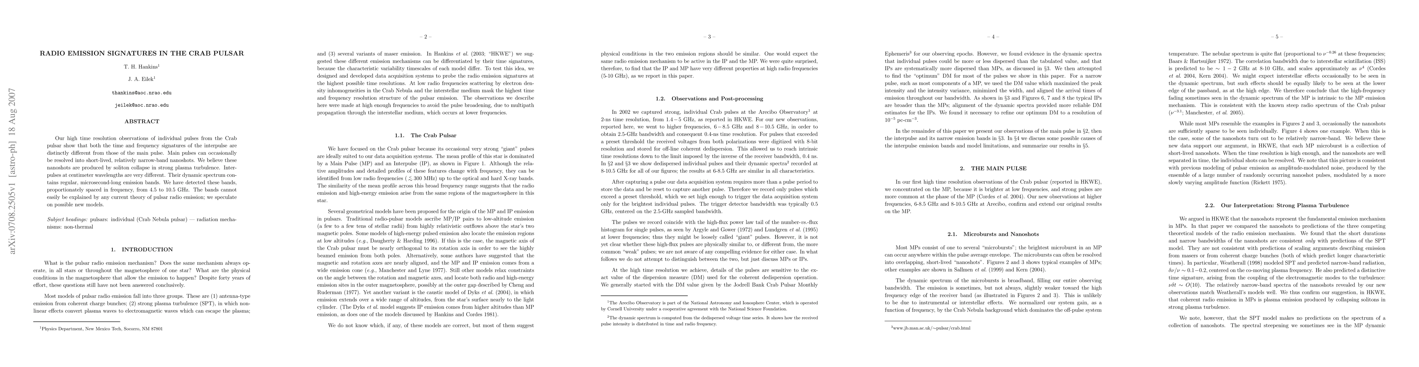 High time resolution observations reveal distinct time and frequency signatures for the Crab pulsar's interpulse compared to its main pulse, with the latter sometimes resolving into nanoshots possibly due to soliton collapse. The interpulse shows unique, proportionately spaced emission bands from 4.5 to 10.5 GHz, challenging current pulsar emission theories.
