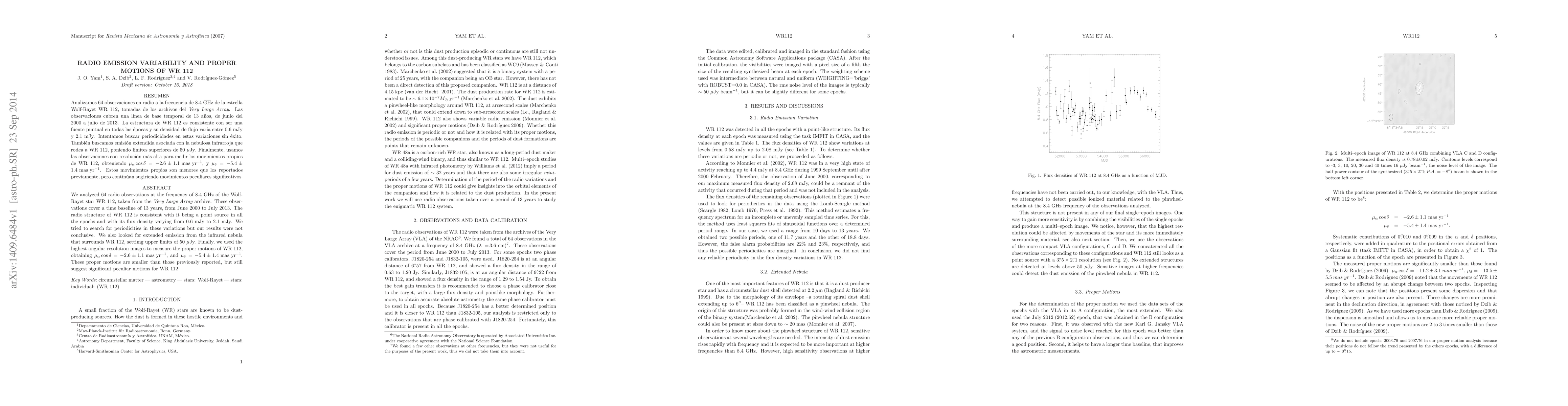 We analyzed 64 radio observations at the frequency of 8.4 GHz of the Wolf-Rayet star WR 112, taken from the Very Large Array archive. These observations cover a time baseline of 13 years, from June 2000 to July 2013. The radio structure of WR 112 is consistent with it being a point source in all the epochs and with its flux density varying from 0.6 mJy to 2.1 mJy. We tried to search for periodicities in these variations but our results were not conclusive. We also looked for extended emission from the infrared nebula that surrounds WR 112, settimg upper limits of 50 $\mu$Jy. Finally, we used the highest angular resolution images to measure the proper motions of WR 112, obtaining $\mu_\alpha\cos \delta = -2.6 \pm 1.1 \mbox{ mas yr$^{-1}$}$, and $\mu_\delta = -5.4 \pm 1.4 \mbox{ mas yr$^{-1}$}$. These proper motions are smaller than those previously reported, but still suggest significant peculiar motions for WR 112.