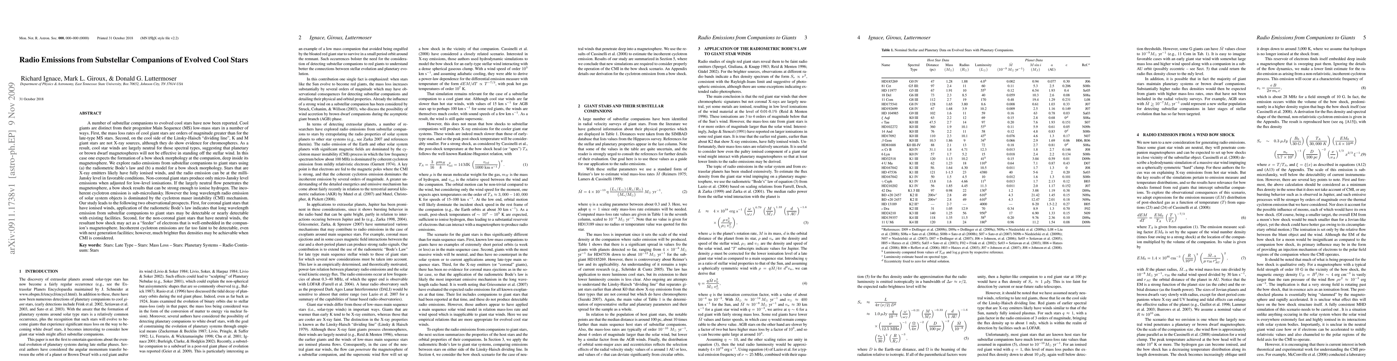 This paper investigates radio emissions from substellar companions to evolved cool giant stars, focusing on the differences in mass loss rates and wind characteristics compared to their progenitor Main Sequence stars. It explores the formation of bow shock morphologies in these companions due to the interaction with the stars' ionised or neutral winds.