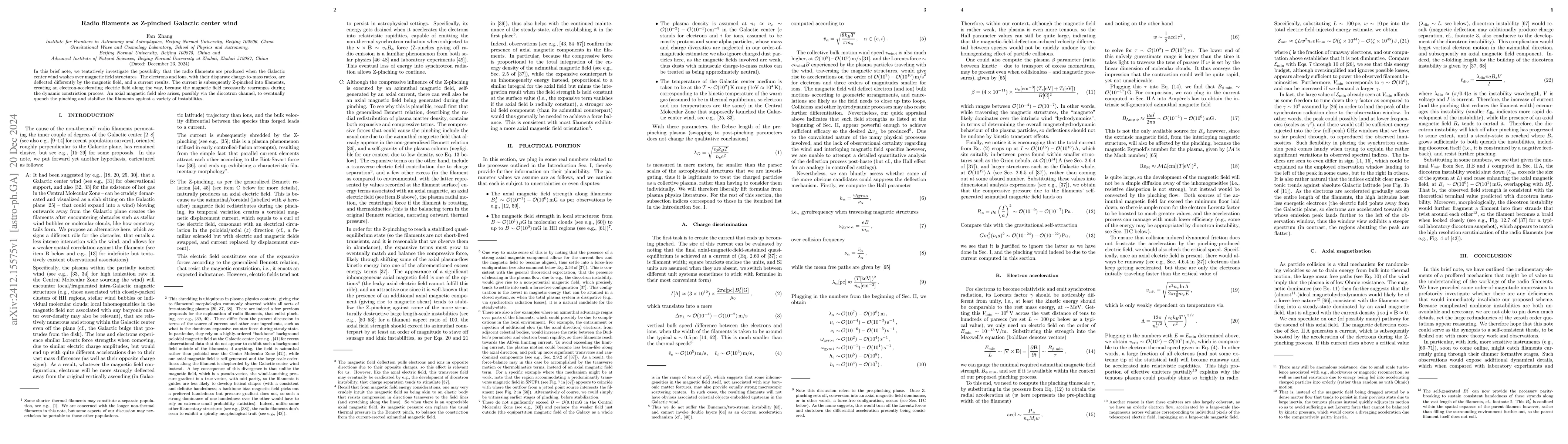 This paper explores the hypothesis that radio filaments near the Galactic center are formed when the Galactic center wind interacts with magnetic field structures, creating Z-pinched filaments through current-driven magnetic constriction and electron acceleration. An axial magnetic field may stabilize these filaments by quenching the pinching process.