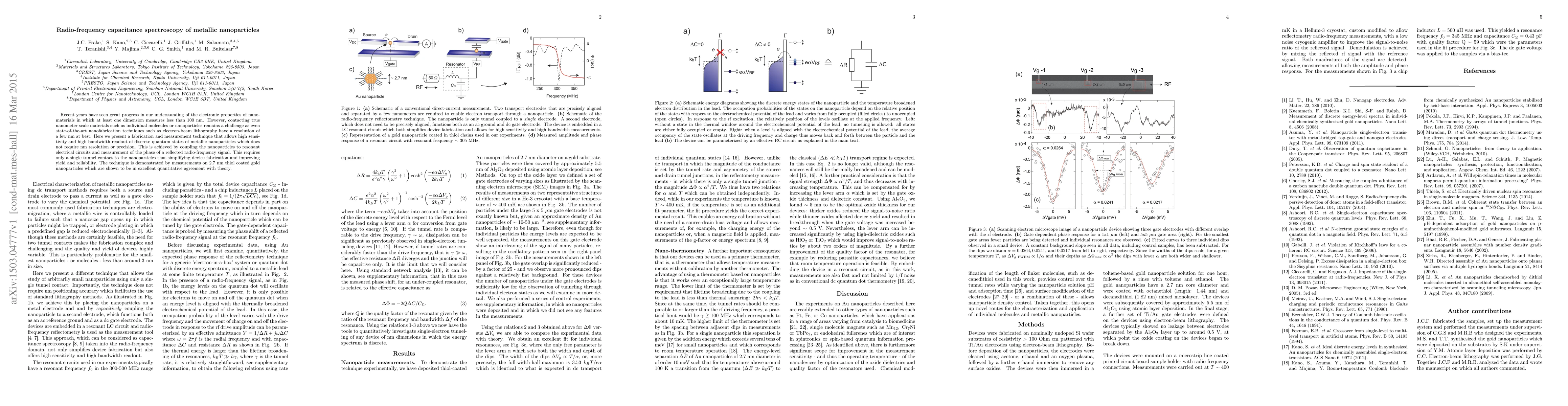 Recent years have seen great progress in our understanding of the electronic properties of nanomaterials in which at least one dimension measures less than 100 nm. However, contacting true nanometer scale materials such as individual molecules or nanoparticles remains a challenge as even state-of-the-art nanofabrication techniques such as electron-beam lithography have a resolution of a few nm at best. Here we present a fabrication and measurement technique that allows high sensitivity and high bandwidth readout of discrete quantum states of metallic nanoparticles which does not require nm resolution or precision. This is achieved by coupling the nanoparticles to resonant electrical circuits and measurement of the phase of a reflected radio-frequency signal. This requires only a single tunnel contact to the nanoparticles thus simplifying device fabrication and improving yield and reliability. The technique is demonstrated by measurements on 2.7 nm thiol coated gold nanoparticles which are shown to be in excellent quantitative agreement with theory.