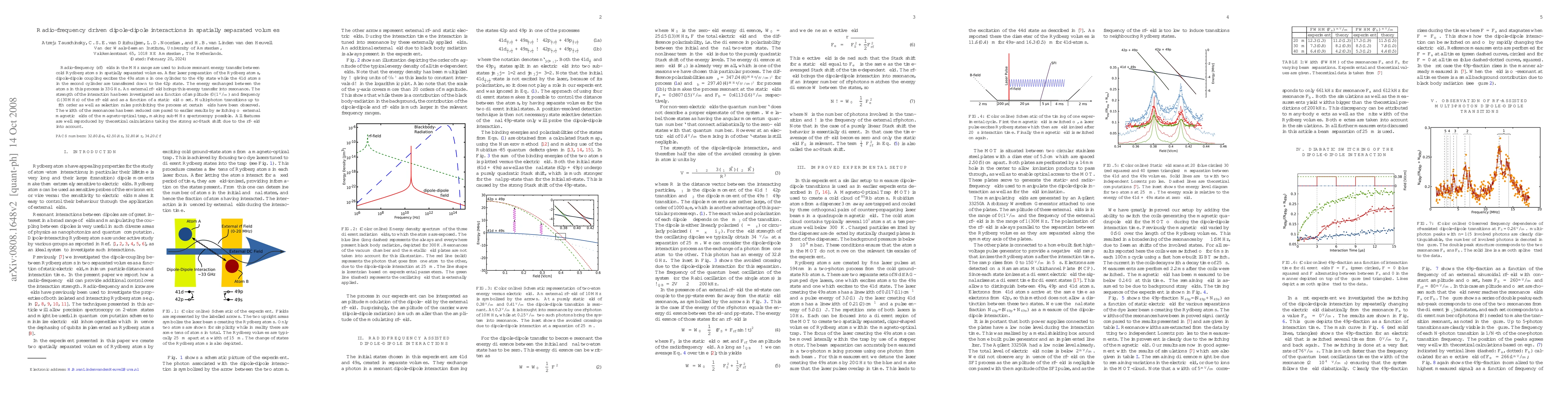 Radio-frequency (rf) fields in the MHz range are used to induce resonant energy transfer between cold Rydberg atoms in spatially separated volumes. After laser preparation of the Rydberg atoms, dipole-dipole coupling excites the 49s atoms in one cylinder to the 49p state while the 41d atoms in the second cylinder are transferred down to the 42p state. The energy exchanged between the atoms in this process is 33 GHz. An external rf-field brings this energy transfer into resonance. The strength of the interaction has been investigated as a function of amplitude (0-1 V/cm) and frequency (1-30 MHz) of the rf-field and as a function of a static field offset. Multi-photon transitions up to fifth order as well as selection rules prohibiting the process at certain fields have been observed. The width of the resonances has been reduced compared to earlier results by switching off external magnetic fields of the magneto-optical trap, making sub-MHz spectroscopy possible. All features are well reproduced by theoretical calculations taking the strong ac-Stark shift due to the rf-field into account.