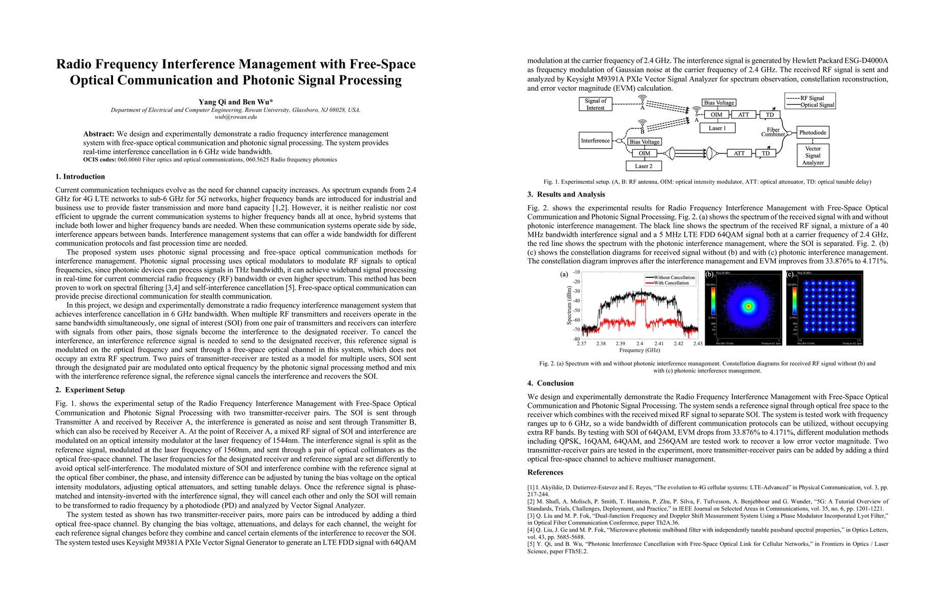 This paper presents a radio frequency interference management system utilizing free-space optical communication and photonic signal processing for real-time interference cancellation across a 6 GHz bandwidth. Experimental results validate the system's effectiveness.