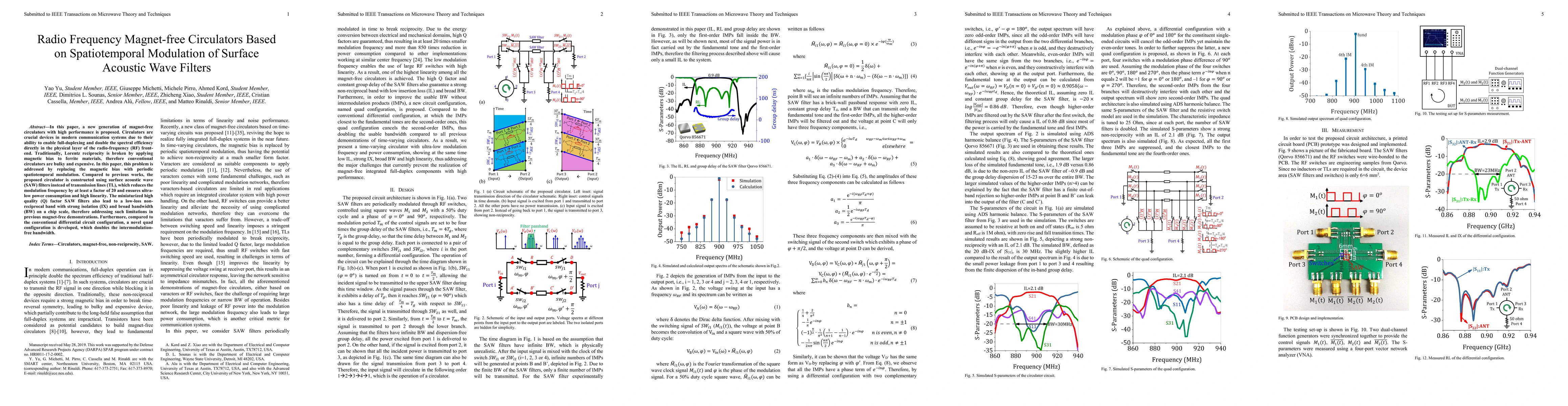 Researchers propose a magnet-free circulator with high performance using spatiotemporal modulation of surface acoustic wave filters, offering ultra-low power consumption and improved isolation and bandwidth.