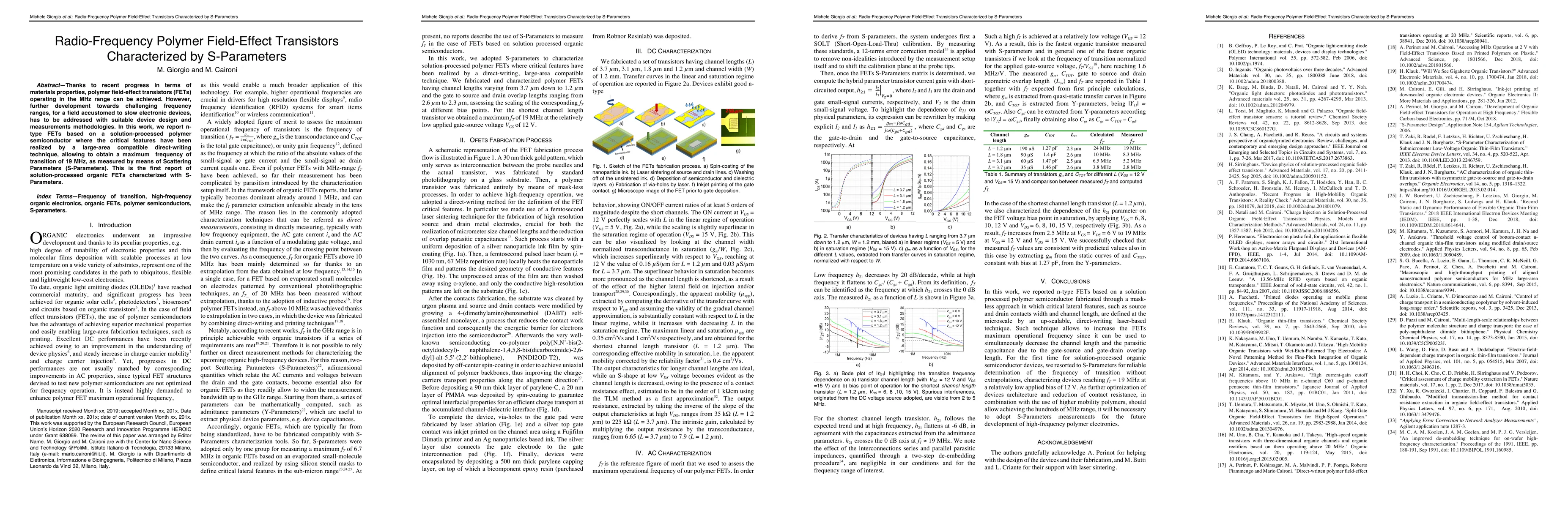 Thanks to recent progress in terms of materials properties, polymer field-effect transistors (FETs) operating in the MHz range can be achieved. However, further development towards challenging frequency ranges, for a field accustomed to slow electronic devices, has to be addressed with suitable device design and measurements methodologies. In this work, we report n-type FETs based on a solution-processed polymer semiconductor where the critical features have been realized by a large-area compatible direct-writing technique, allowing to obtain a maximum frequency of transition of 19 MHz, as measured by means of Scattering Parameters (S-Parameters). This is the first report of solution-processed organic FETs characterized with S-Parameters.