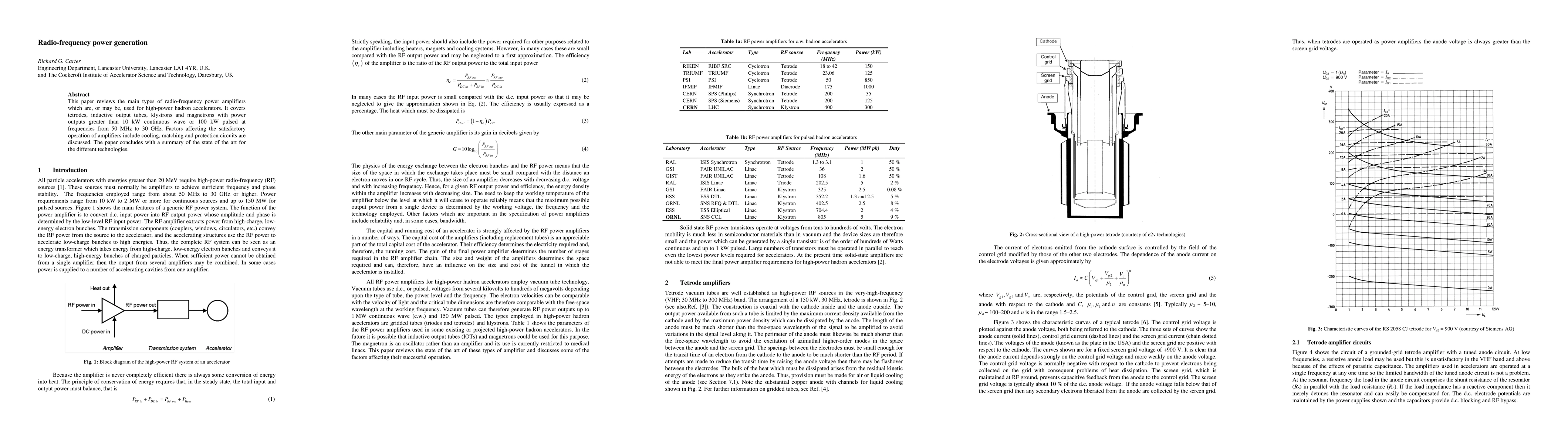 This paper reviews radio-frequency power amplifiers used in high-power hadron accelerators, highlighting key technologies like tetrodes, klystrons, and magnetrons, as well as factors affecting their operation such as cooling and protection circuits.