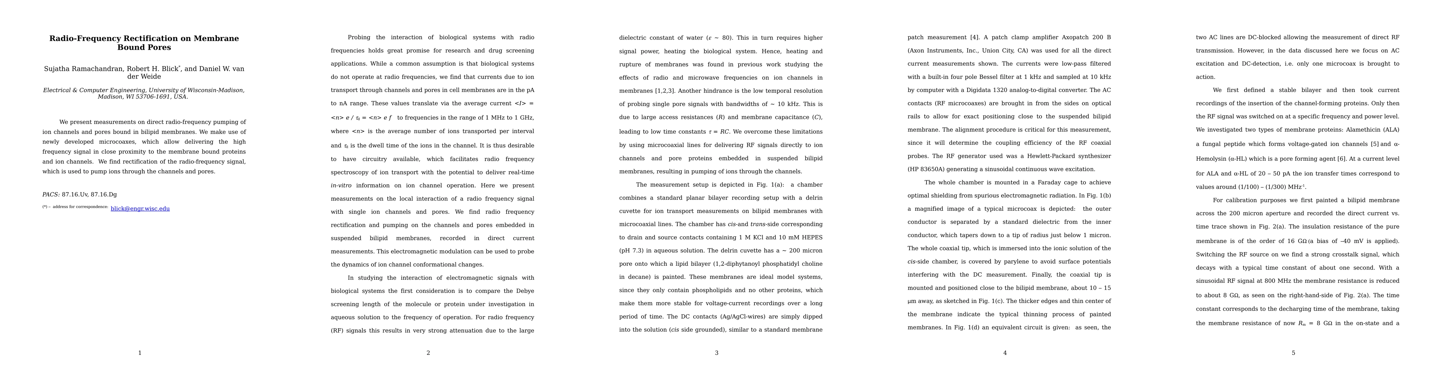 This study measures radio-frequency rectification on membrane-bound pores, utilizing novel microcoaxes to deliver high-frequency signals. The research demonstrates that the rectified radio-frequency signal can effectively pump ions through ion channels and pores embedded in bilipid membranes.