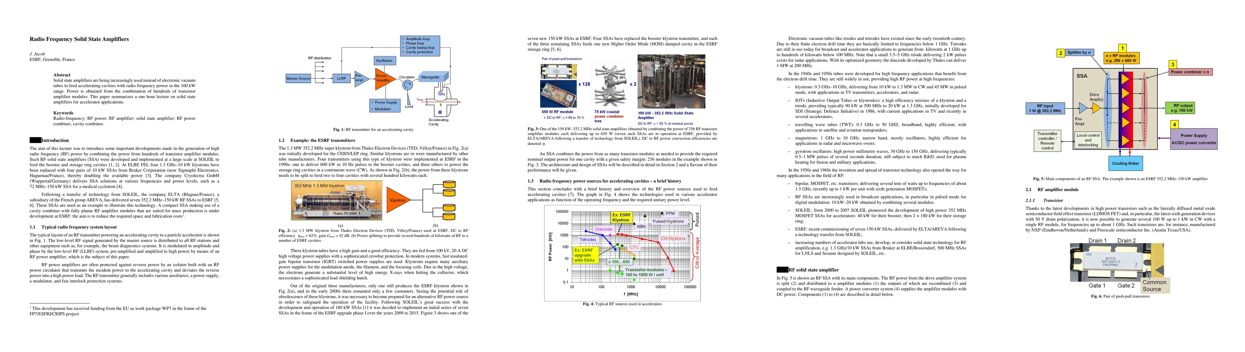 This paper discusses solid state amplifiers used in accelerating cavities for high-power radio frequency applications, highlighting their use as a replacement for electronic vacuum tubes. It summarizes key concepts and findings from a lecture on the topic for accelerator applications.
