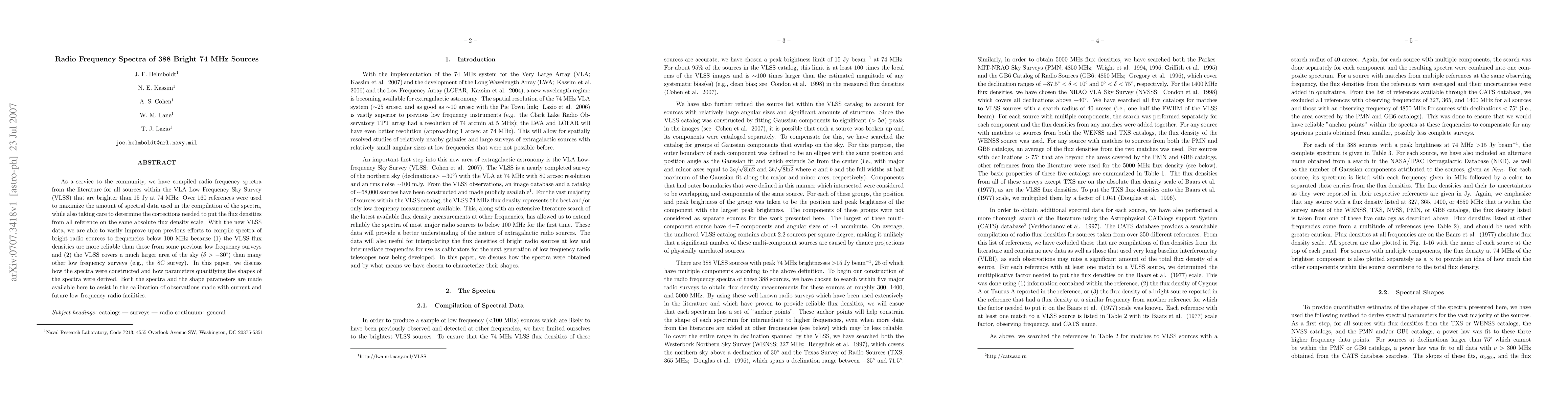 This paper compiles radio frequency spectra for 388 bright sources (brighter than 15 Jy at 74 MHz) from the VLA Low Frequency Sky Survey (VLSS), utilizing over 160 references to ensure accurate flux density scaling. The VLSS data improves spectral compilations below 100 MHz due to its reliability and broader sky coverage.