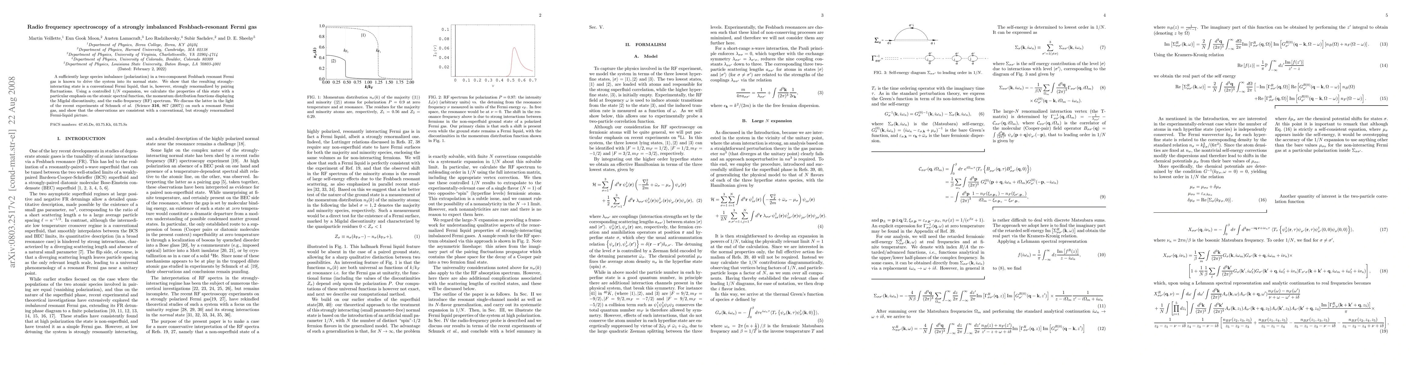 This paper investigates the radio frequency spectroscopy of a strongly imbalanced Feshbach-resonant Fermi gas, demonstrating that the system exhibits a conventional Fermi liquid with significant renormalization due to pairing fluctuations. The study uses a 1/N expansion to analyze the spectral function and RF spectrum, confirming experimental observations by Schunck et al.