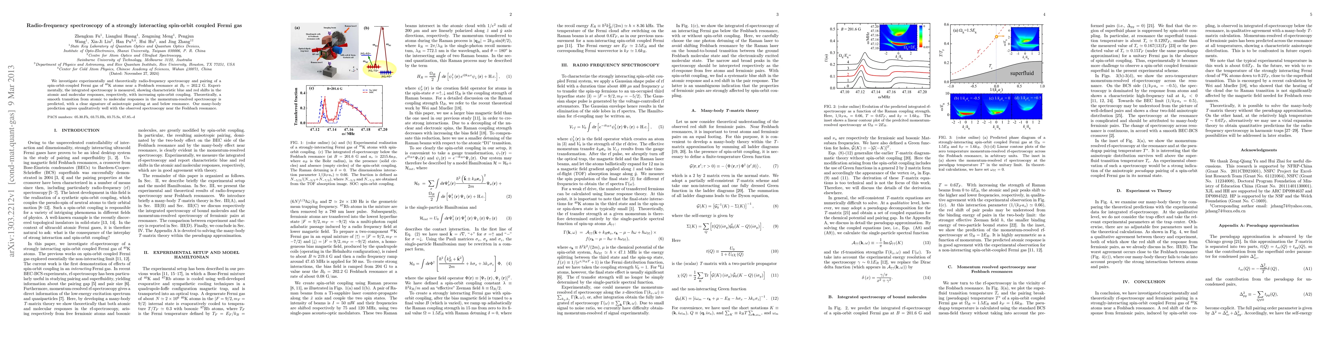 This paper investigates radio-frequency spectroscopy of a spin-orbit coupled Fermi gas of $^{40}$K atoms near a Feshbach resonance, revealing blue and red shifts in atomic and molecular responses. Theoretical predictions of a smooth transition and anisotropic pairing match the experimental observations.