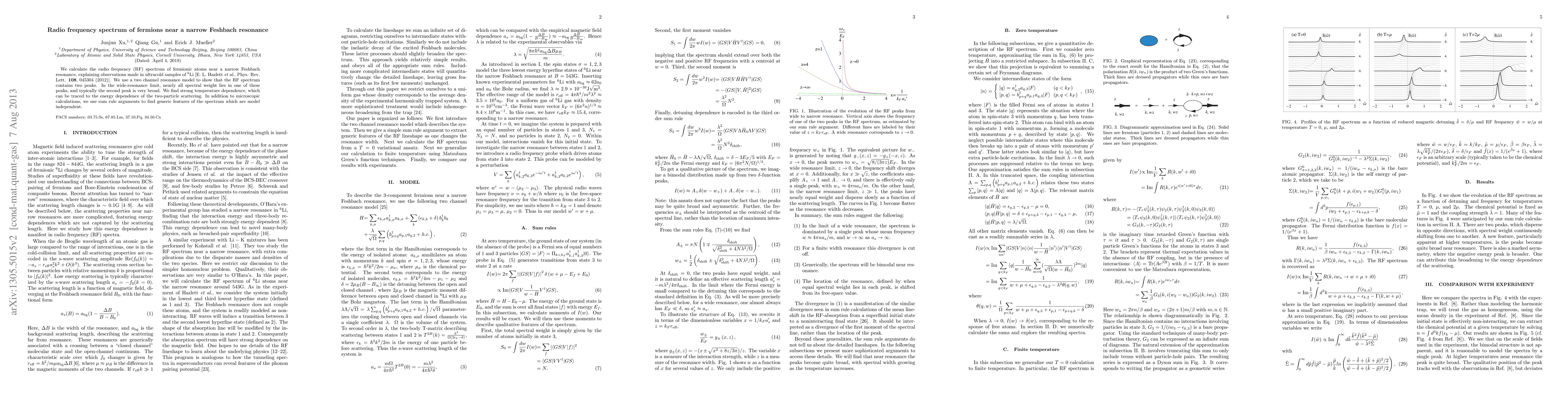 We calculate the radio frequency (RF) spectrum of fermionic atoms near a narrow Feshbach resonance, explaining observations made in ultracold samples of $^6\rm{Li}$ [E. L. Hazlett {\it et al.}, Phys. Rev. Lett. {\bf 108}, 045304 (2012)]. We use a two channel resonance model to show that the RF spectrum contains two peaks. In the wide-resonance limit, nearly all spectral weight lies in one of these peaks, and typically the second peak is very broad. We find strong temperature dependence, which can be traced to the energy dependence of the two-particle scattering. In addition to microscopic calculations, we use sum rule arguments to find generic features of the spectrum which are model independent.
