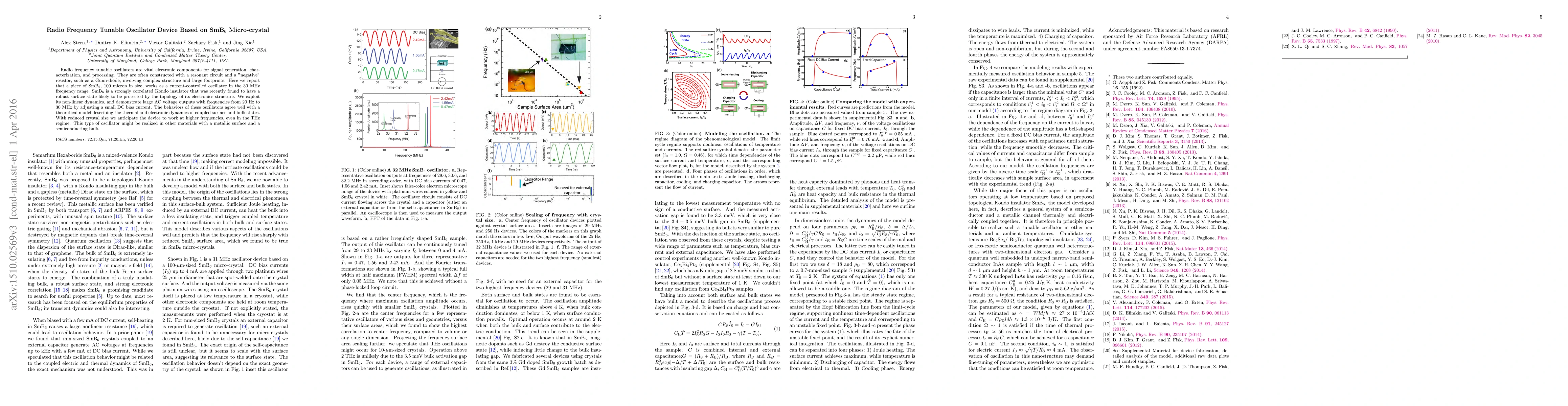 Radio frequency tunable oscillators are vital electronic components for signal generation, characterization, and processing. They are often constructed with a resonant circuit and a 'negative' resistor, such as a Gunn-diode, involving complex structure and large footprints. Here we report that a piece of SmB6, 100 micron in size, works as a current-controlled oscillator in the 30 MHz frequency range. SmB6 is a strongly correlated Kondo insulator that was recently found to have a robust surface state likely to be protected by the topology of its electronics structure. We exploit its non-linear dynamics, and demonstrate large AC voltage outputs with frequencies from 20 Hz to 30 MHz by adjusting a small DC bias current. The behaviors of these oscillators agree well with a theoretical model describing the thermal and electronic dynamics of coupled surface and bulk states. With reduced crystal size we anticipate the device to work at higher frequencies, even in the THz regime. This type of oscillator might be realized in other materials with a metallic surface and a semiconducting bulk.