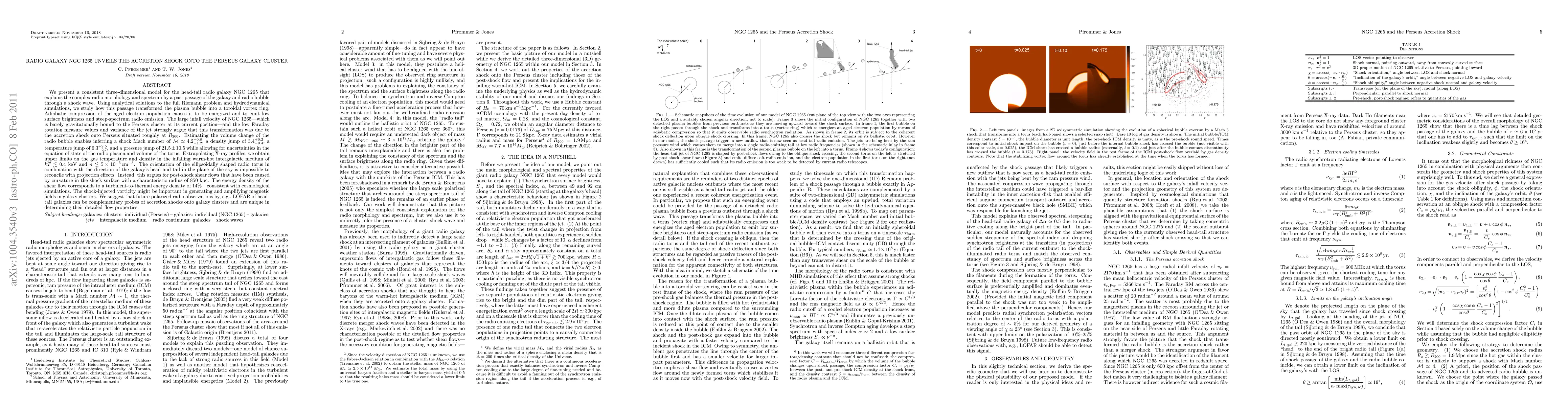 We present a consistent 3D model for the head-tail radio galaxy NGC 1265 that explains the complex radio morphology and spectrum by a past passage of the galaxy and radio bubble through a shock wave. Using analytical solutions to the full Riemann problem and hydrodynamical simulations, we study how this passage transformed the plasma bubble into a toroidal vortex ring. Adiabatic compression of the aged electron population causes it to be energized and to emit low-surface brightness and steep-spectrum radio emission. The large infall velocity of NGC 1265 and the low Faraday rotation measure values and variance of the jet strongly argue that this transformation was due to the accretion shock onto Perseus situated roughly at R_200. Estimating the volume change of the radio bubble enables inferring a shock Mach number of M = 4.2_{-1.2}^{+0.8}, a density jump of 3.4_{-0.4}^{+0.2}, a temperature jump of 6.3_{-2.7}^{+2.5}, and a pressure jump of 21.5 +/- 10.5 while allowing for uncertainties in the equation of state of the radio plasma and volume of the torus. Extrapolating X-ray profiles, we obtain upper limits on the gas temperature and density in the infalling warm-hot intergalactic medium of kT < 0.4 keV and n < 5e-5 / cm^3. The orientation of the ellipsoidally shaped radio torus in combination with the direction of the galaxy's head and tail in the plane of the sky is impossible to reconcile with projection effects. Instead, this argues for post-shock shear flows that have been caused by curvature in the shock surface with a characteristic radius of 850 kpc. The energy density of the shear flow corresponds to a turbulent-to-thermal energy density of 14%. The shock-injected vorticity might be important in generating and amplifying magnetic fields in galaxy clusters. Future LOFAR observations of head-tail galaxies can be complementary probes of accretion shocks onto galaxy clusters.