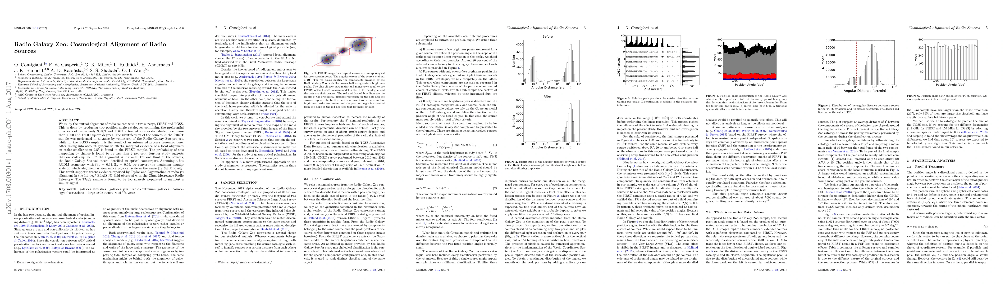 We study the mutual alignment of radio sources within two surveys, FIRST and TGSS. This is done by producing two position angle catalogues containing the preferential directions of respectively $30\,059$ and $11\,674$ extended sources distributed over more than $7\,000$ and $17\,000$ square degrees. The identification of the sources in the FIRST sample was performed in advance by volunteers of the Radio Galaxy Zoo project, while for the TGSS sample it is the result of an automated process presented here. After taking into account systematic effects, marginal evidence of a local alignment on scales smaller than $2.5\deg$ is found in the FIRST sample. The probability of this happening by chance is found to be less than $2$ per cent. Further study suggests that on scales up to $1.5\deg$ the alignment is maximal. For one third of the sources, the Radio Galaxy Zoo volunteers identified an optical counterpart. Assuming a flat $\Lambda$CDM cosmology with $\Omega_m = 0.31, \Omega_\Lambda = 0.69$, we convert the maximum angular scale on which alignment is seen into a physical scale in the range $[19, 38]$ Mpc $h_{70}^{-1}$. This result supports recent evidence reported by Taylor and Jagannathan of radio jet alignment in the $1.4$ deg$^2$ ELAIS N1 field observed with the Giant Metrewave Radio Telescope. The TGSS sample is found to be too sparsely populated to manifest a similar signal.