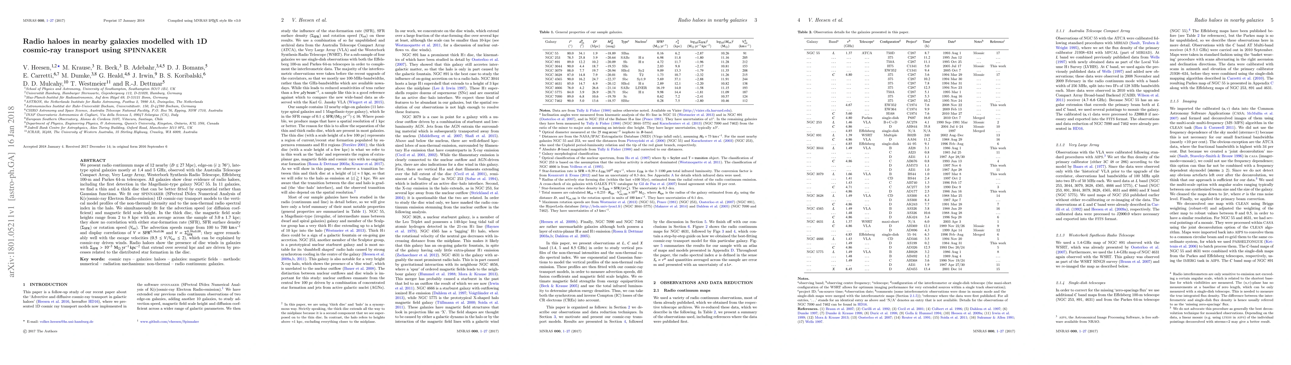 We present radio continuum maps of 12 nearby ($D\leq 27~\rm Mpc$), edge-on ($i\geq 76^{\circ}$), late-type spiral galaxies mostly at $1.4$ and 5 GHz, observed with the Australia Telescope Compact Array, Very Large Array, Westerbork Synthesis Radio Telescope, Effelsberg 100-m and Parkes 64-m telescopes. All galaxies show clear evidence of radio haloes, including the first detection in the Magellanic-type galaxy NGC 55. In 11 galaxies, we find a thin and a thick disc that can be better fitted by exponential rather than Gaussian functions. We fit our SPINNAKER (SPectral INdex Numerical Analysis of K(c)osmic-ray Electron Radio-emission) 1D cosmic-ray transport models to the vertical model profiles of the non-thermal intensity and to the non-thermal radio spectral index in the halo. We simultaneously fit for the advection speed (or diffusion coefficient) and magnetic field scale height. In the thick disc, the magnetic field scale heights range from 2 to 8 kpc with an average across the sample of $3.0\pm 1.7~\rm kpc$; they show no correlation with either star-formation rate (SFR), SFR surface density ($\Sigma_{\rm SFR}$) or rotation speed ($V_{\rm rot}$). The advection speeds range from 100 to $700~\rm km\,s^{-1}$ and display correlations of $V\propto \rm SFR^{0.36\pm 0.06}$ and $V\propto \Sigma_{\rm SFR}^{0.39\pm 0.09}$; they agree remarkably well with the escape velocities ($0.5\leq V/V_{\rm esc}\leq 2$), which can be explained by cosmic-ray driven winds. Radio haloes show the presence of disc winds in galaxies with $\Sigma_{\rm SFR} > 10^{-3}~\rm M_{\odot}\,yr^{-1}\,kpc^{-2}$ that extend over several kpc and are driven by processes related to the distributed star formation in the disc.