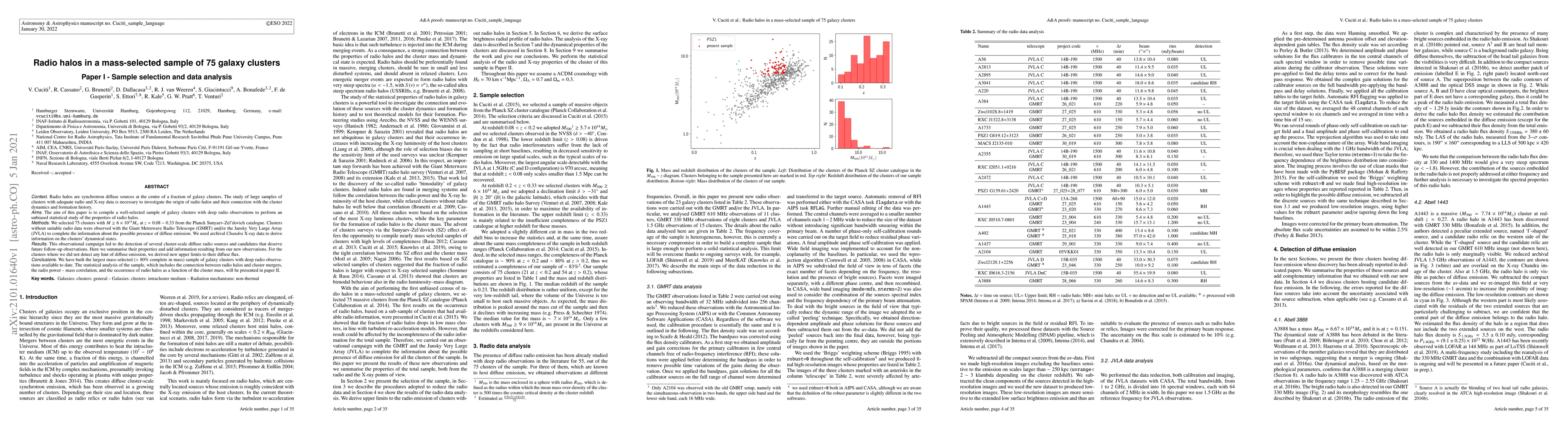 Radio halos are synchrotron diffuse sources at the centre of a fraction of galaxy clusters. The study of large samples of clusters with adequate radio and X-ray data is necessary to investigate the origin of radio halos and their connection with the cluster dynamics and formation history. The aim of this paper is to compile a well-selected sample of galaxy clusters with deep radio observations to perform an unbiased statistical study of the properties of radio halos. We selected 75 clusters with M > = 6e14 Msun at z=0.08-0.33 from the Planck Sunyaev-Zel'dovich catalogue. Clusters without suitable radio data were observed with the Giant Metrewave Radio Telescope (GMRT) and/or the Jansky Very Large Array (JVLA) to complete the information about the possible presence of diffuse emission. We used archival Chandra X-ray data to derive information on the clusters' dynamical states. This observational campaign led to the detection of several cluster-scale diffuse radio sources and candidates that deserve future follow-up observations. Here we summarise their properties and add information resulting from our new observations. For the clusters where we did not detect any hint of diffuse emission, we derived new upper limits to their diffuse flux. We have built the largest mass-selected (> 80 per cent complete in mass) sample of galaxy clusters with deep radio observations available to date. The statistical analysis of the sample, which includes the connection between radio halos and cluster mergers, the radio power-mass correlation, and the occurrence of radio halos as a function of the cluster mass, will be presented in paper II.