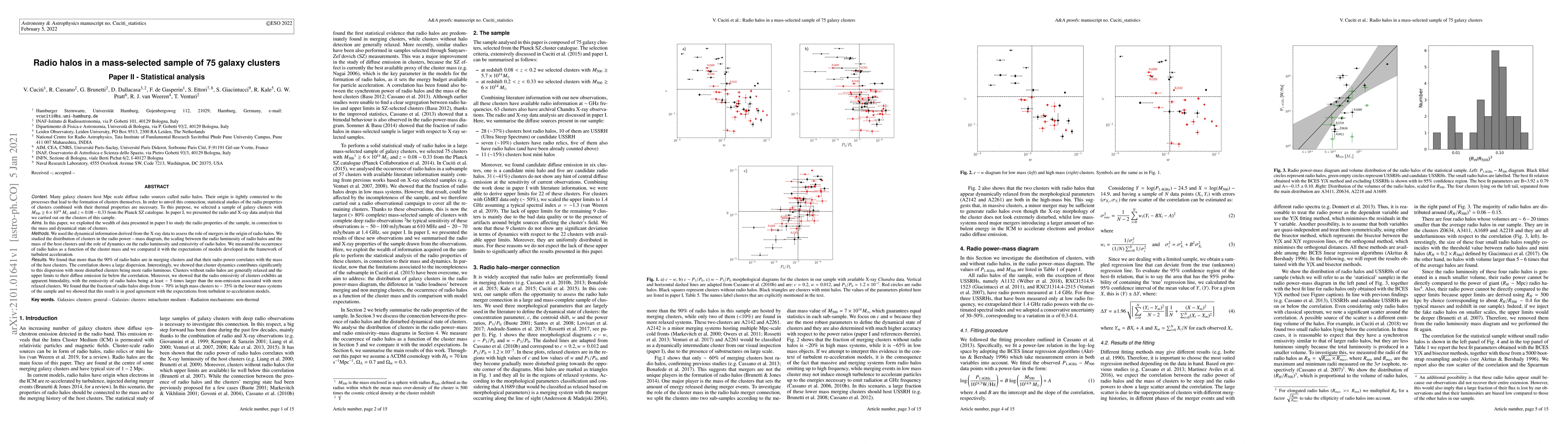 A study of 75 galaxy clusters found that more than 90% of radio halos are in merging clusters, with their power correlating with the host cluster mass, and that cluster dynamics significantly contributes to this dispersion.