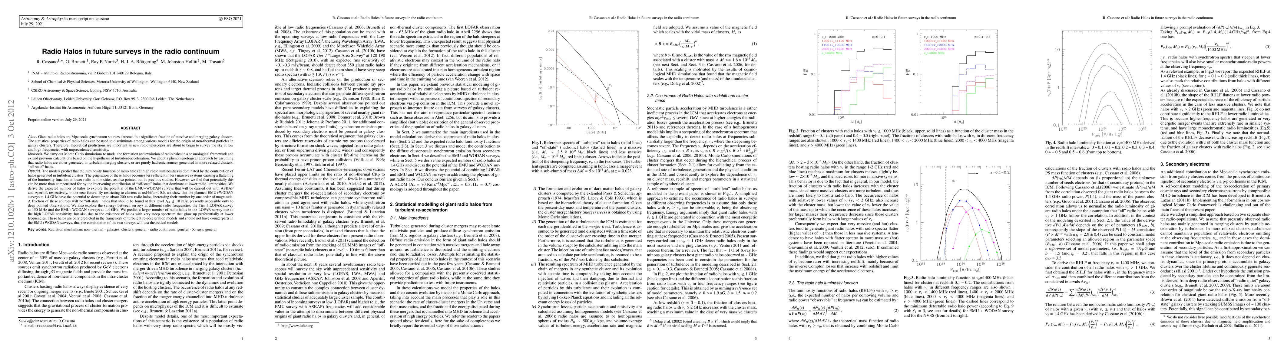 This paper uses Monte Carlo simulations to predict the formation and evolution of giant radio halos in galaxy clusters, showing that future radio surveys will detect up to 200 RH, especially in turbulent clusters. The combination of LOFAR and EMU+WODAN surveys will test theoretical models, with LOFAR detecting RH with steep spectra.