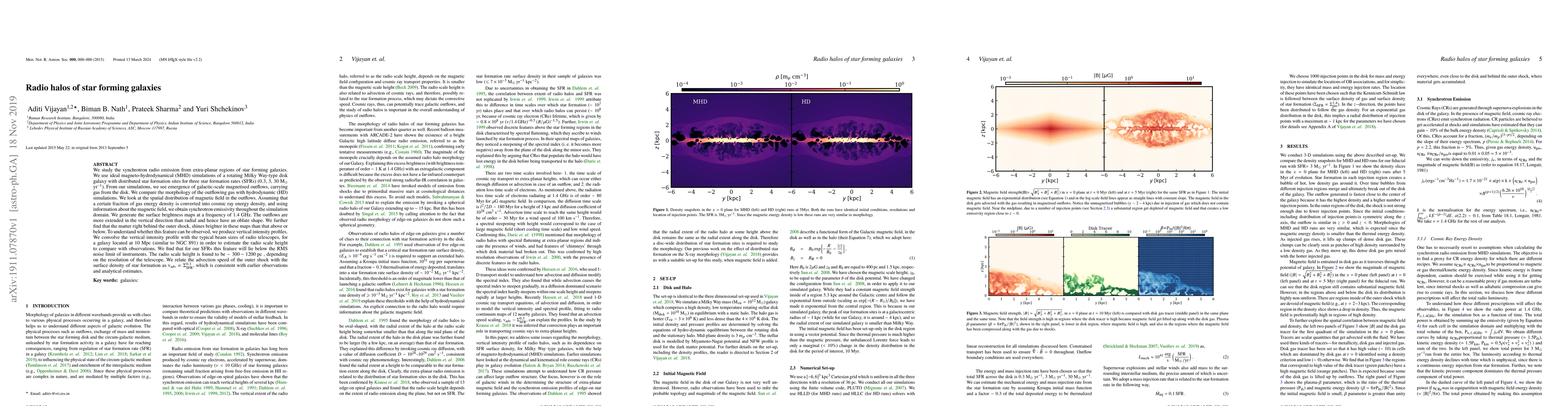 We study the synchrotron radio emission from extra-planar regions of star forming galaxies. We use ideal magneto-hydrodynamical (MHD) simulations of a rotating Milky Way-type disk galaxy with distributed star formation sites for three star formation rates (SFRs) (0.3, 3, 30 M$_{\odot}$ yr$^{-1}$). From our simulations, we see emergence of galactic-scale magnetised outflows, carrying gas from the disk. We compare the morphology of the outflowing gas with hydrodynamic (HD) simulations. We look at the spatial distribution of magnetic field in the outflows. Assuming that a certain fraction of gas energy density is converted into cosmic ray energy density, and using information about the magnetic field, we obtain synchrotron emissivity throughout the simulation domain. We generate the surface brightness maps at a frequency of 1.4 GHz. The outflows are more extended in the vertical direction than radial and hence have an oblate shape. We further find that the matter right behind the outer shock, shines brighter in these maps than that above or below. To understand whether this feature can be observed, we produce vertical intensity profiles. We convolve the vertical intensity profile with the typical beam sizes of radio telescopes, for a galaxy located at 10 Mpc (similar to NGC 891) in order to estimate the radio scale height to compare with observations. We find that for our SFRs this feature will lie below the RMS noise limit of instruments. The radio scale height is found to be $\sim 300-1200$ pc , depending on the resolution of the telescope. We relate the advection speed of the outer shock with the surface density of star formation as $\rm{v}_{\rm adv} \propto \Sigma_{\rm SFR}^{0.3}$ which is consistent with earlier observations and analytical estimates.
