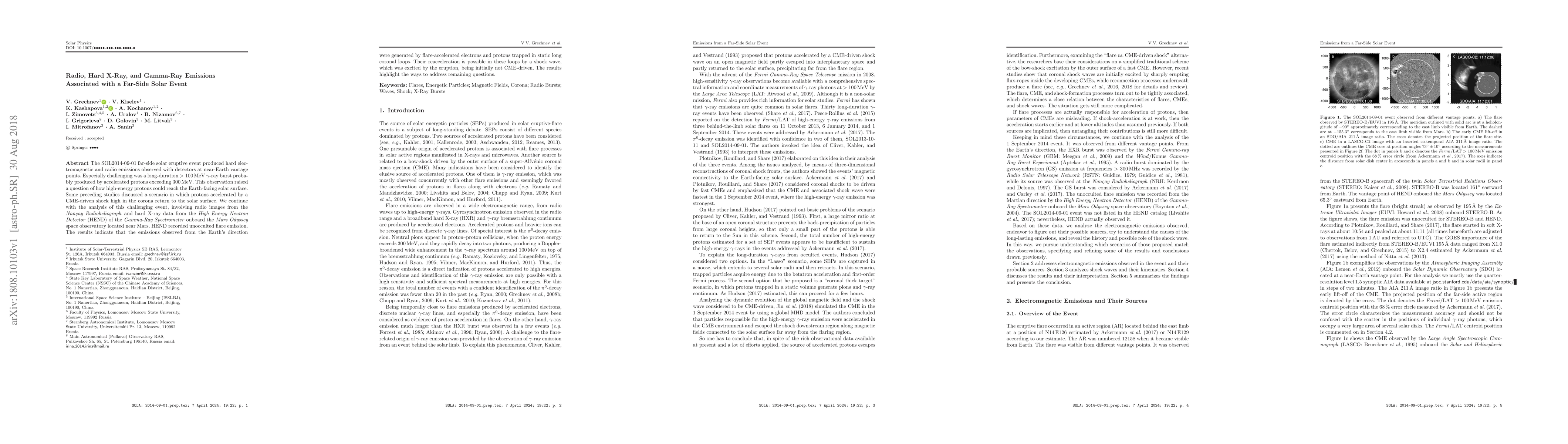 This paper investigates the SOL2014-09-01 far-side solar event, analyzing radio, hard X-ray, and gamma-ray emissions, and finds that high-energy protons likely reached the Earth-facing solar surface via reacceleration in static coronal loops by a shock wave excited by the eruption. The study uses data from the Nançay Radioheliograph and Mars Odyssey's HEND.