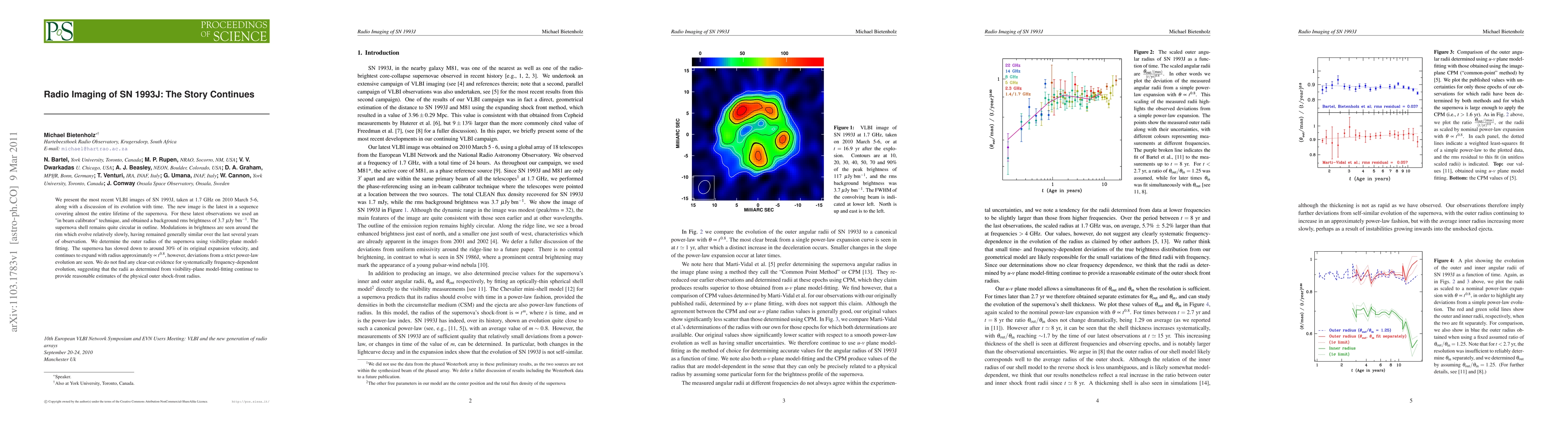 We present the most recent VLBI images of SN 1993J, taken at 1.7 GHz on 2010 March 5-6, along with a discussion of its evolution with time. The new image is the latest in a sequence covering almost the entire lifetime of the supernova. For these latest observations we used an "in beam calibrator" technique, and obtained a background rms brightness of 3.7 micro-Jy/beam. The supernova shell remains quite circular in outline. Modulations in brightness are seen around the rim which evolve relatively slowly, having remained generally similar over the last several years of observation. We determine the outer radius of the supernova using visibility-plane model-fitting. The supernova has slowed down to around 30% of its original expansion velocity, and continues to expand with radius approximately proportional to t^0.8, however, deviations from a strict power-law evolution are seen. We do not find any clear-cut evidence for systematically frequency-dependent evolution, suggesting that the radii as determined from visibility-plane model-fitting continue to provide reasonable estimates of the physical outer shock-front radius.