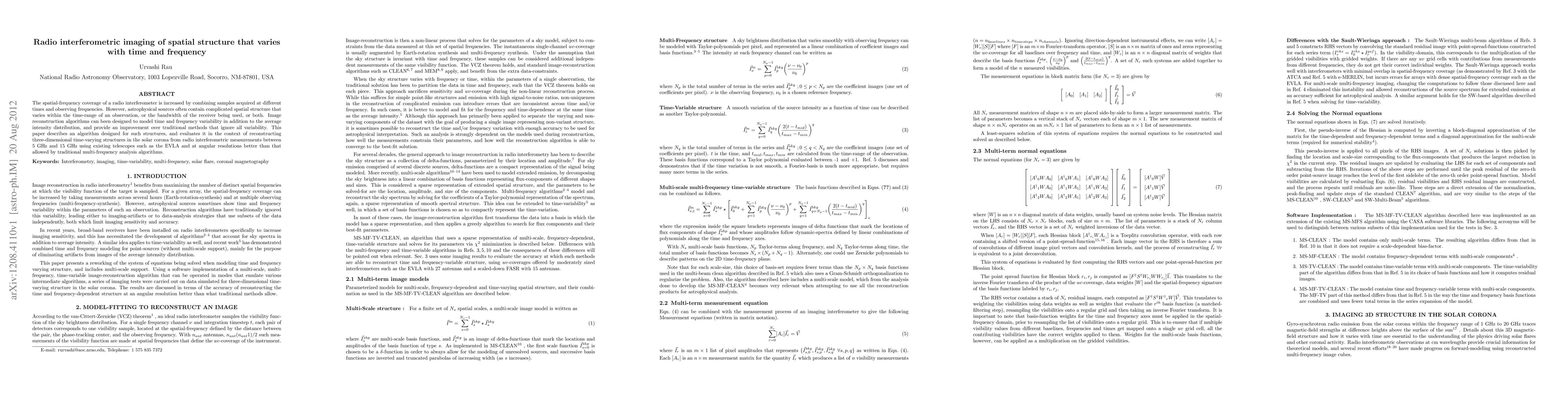 The spatial-frequency coverage of a radio interferometer is increased by combining samples acquired at different times and observing frequencies. However, astrophysical sources often contain complicated spatial structure that varies within the time-range of an observation, or the bandwidth of the receiver being used, or both. Image reconstruction algorithms can been designed to model time and frequency variability in addition to the average intensity distribution, and provide an improvement over traditional methods that ignore all variability. This paper describes an algorithm designed for such structures, and evaluates it in the context of reconstructing three-dimensional time-varying structures in the solar corona from radio interferometric measurements between 5 GHz and 15 GHz using existing telescopes such as the EVLA and at angular resolutions better than that allowed by traditional multi-frequency analysis algorithms.