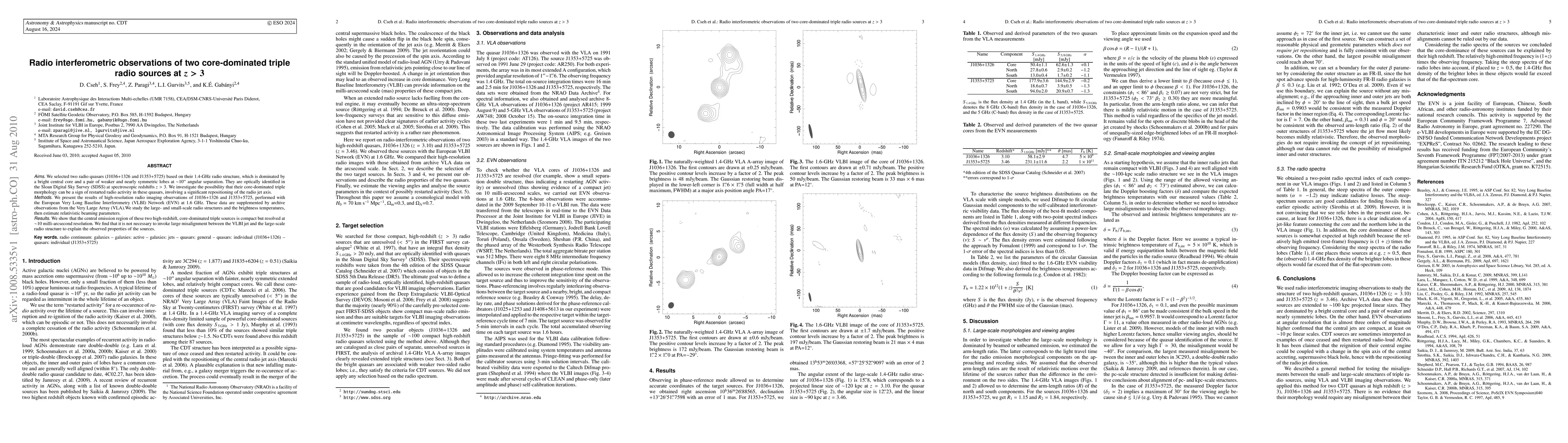 Aims. We selected two radio quasars (J1036+1326 and J1353+5725) based on their 1.4-GHz radio structure, which is dominated by a bright central core and a pair of weaker and nearly symmetric lobes at ~10" angular separation. They are optically identified in the Sloan Digital Sky Survey (SDSS) at spectroscopic redshifts z>3. We investigate the possibility that their core-dominated triple morphology can be a sign of restarted radio activity in these quasars, involving a significant repositioning of the radio jet axis. Methods. We present the results of high-resolution radio imaging observations of J1036+1326 and J1353+5725, performed with the European Very Long Baseline Interferometry (VLBI) Network (EVN) at 1.6 GHz. These data are supplemented by archive observations from the Very Large Array (VLA).We study the large- and small-scale radio structures and the brightness temperatures, then estimate relativistic beaming parameters. Results. We show that the central emission region of these two high-redshift, core-dominated triple sources is compact but resolved at ~10 milli-arcsecond resolution. We find that it is not necessary to invoke large misalignment between the VLBI jet and the large-scale radio structure to explain the observed properties of the sources.