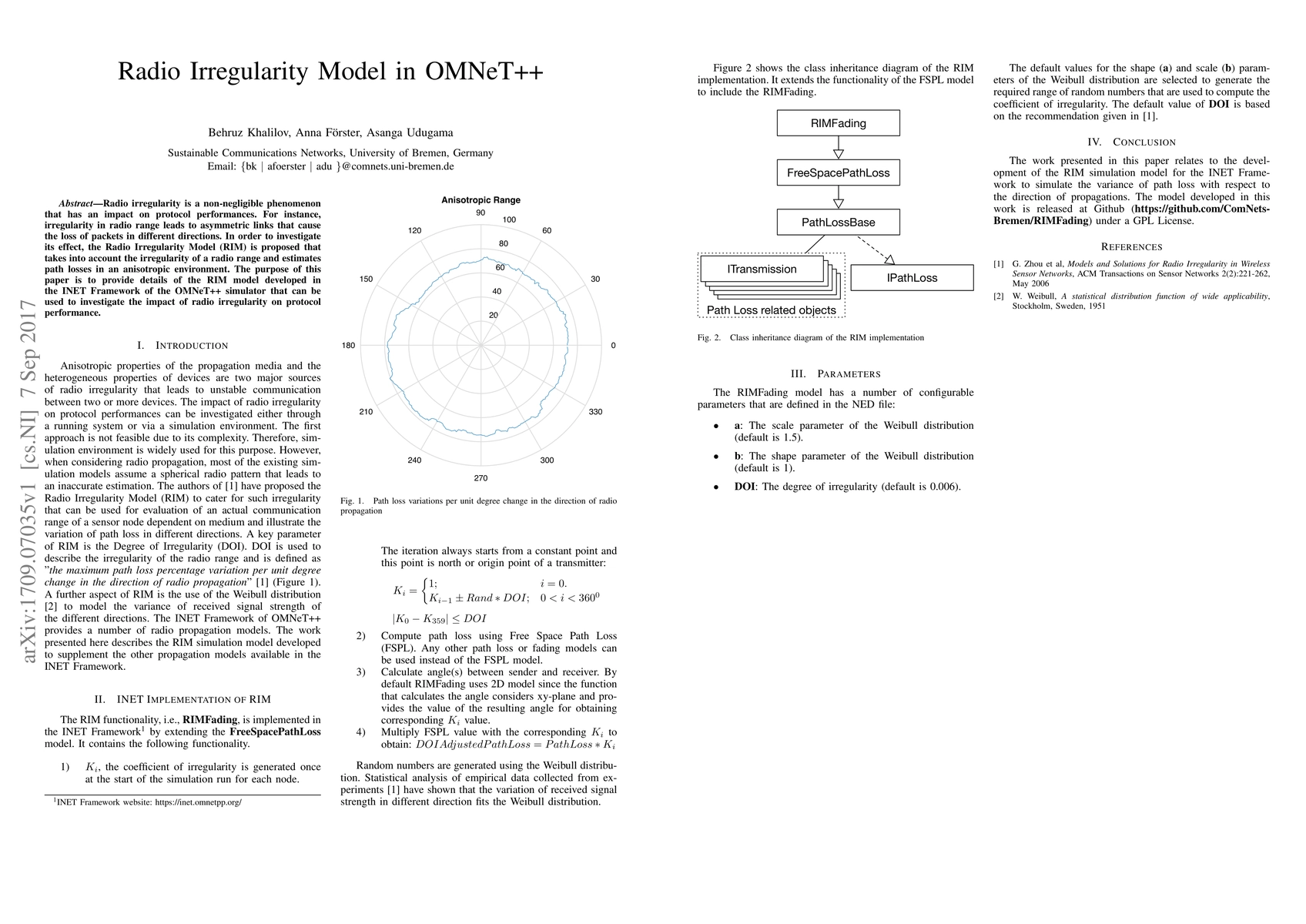 Radio irregularity is a non-negligible phenomenon that has an impact on protocol performances. For instance, irregularity in radio range leads to asymmetric links that cause the loss of packets in different directions. In order to investigate its effect, the Radio Irregularity Model (RIM) is proposed that takes into account the irregularity of a radio range and estimates path losses in an anisotropic environment. The purpose of this paper is to provide details of the RIM model developed in the INET Framework of the OMNeT++ simulator that can be used to investigate the impact of radio irregularity on protocol performance.