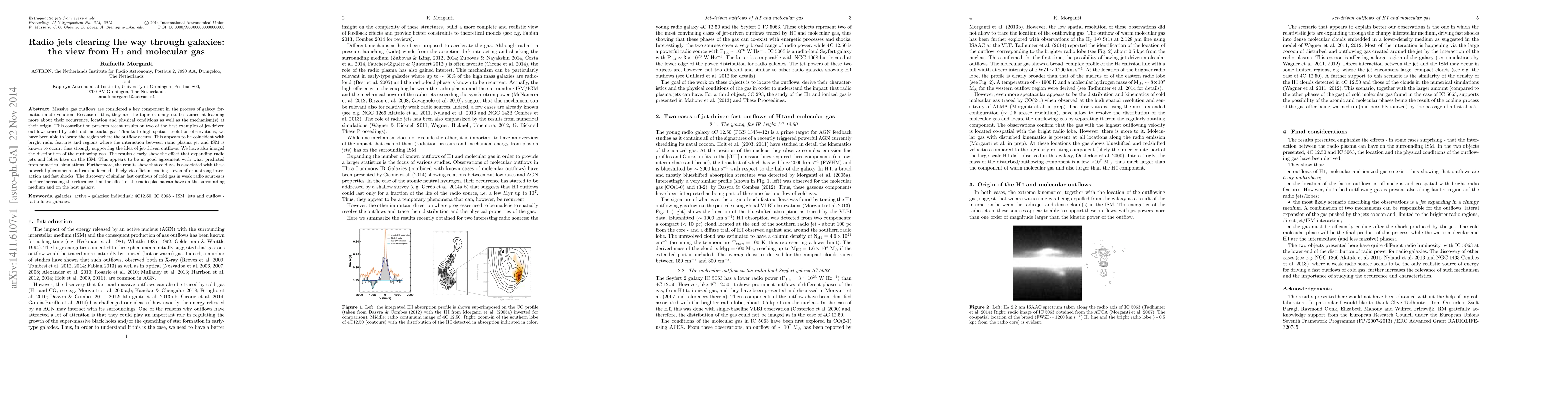 This paper investigates massive gas outflows in galaxies driven by radio jets, using high-resolution observations to trace cold and molecular gas. The findings confirm that radio jets significantly impact the interstellar medium (ISM), with cold gas likely forming via cooling after interactions with powerful jets, supporting numerical simulations.