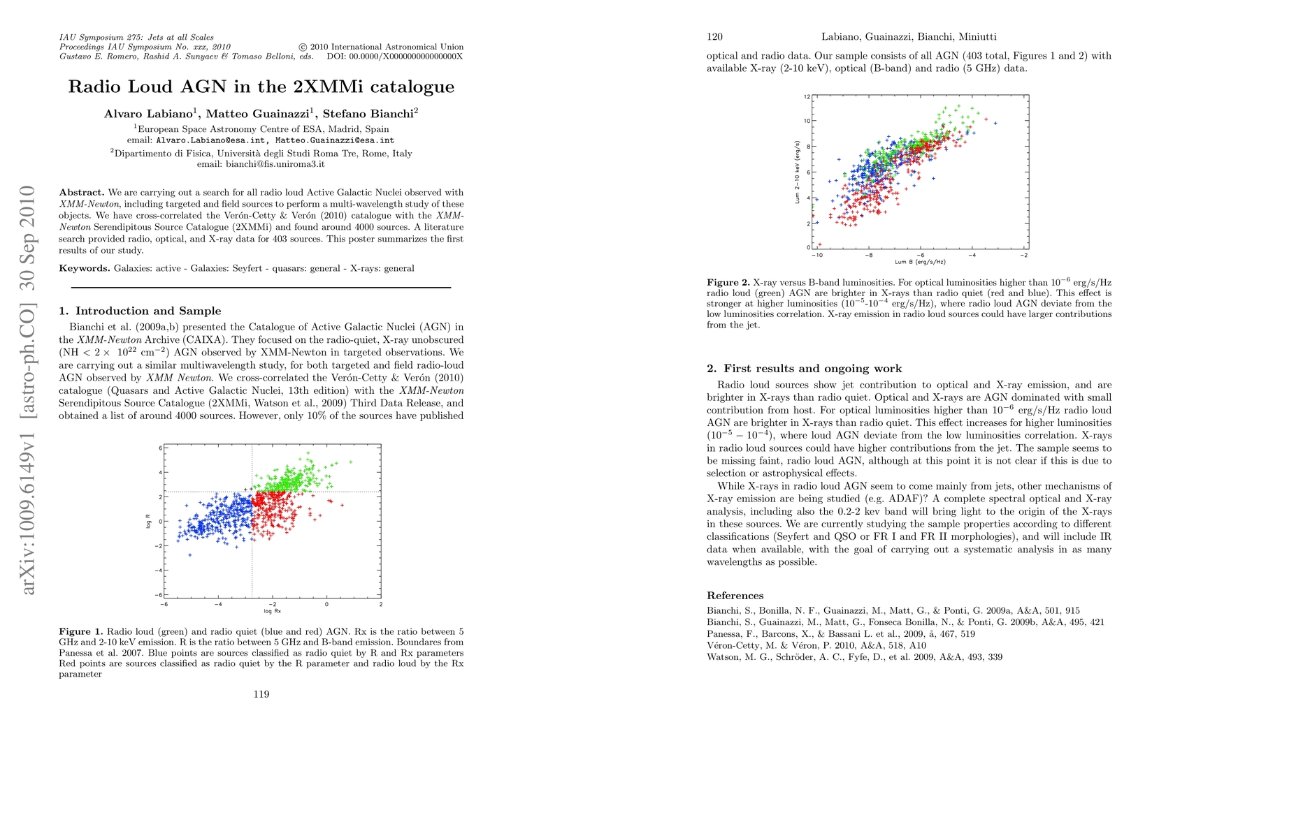 We are carrying out a search for all radio loud Active Galactic Nuclei observed with XMM-Newton, including targeted and field sources to perform a multi-wavelength study of these objects. We have cross-correlated the Veron-Cetty & Veron (2010) catalogue with the XMM-Newton Serendipitous Source Catalogue (2XMMi) and found about 4000 matched sources. A literature search provided radio, optical, and X-ray data for 403 sources. Here we summarize the first results of our study.