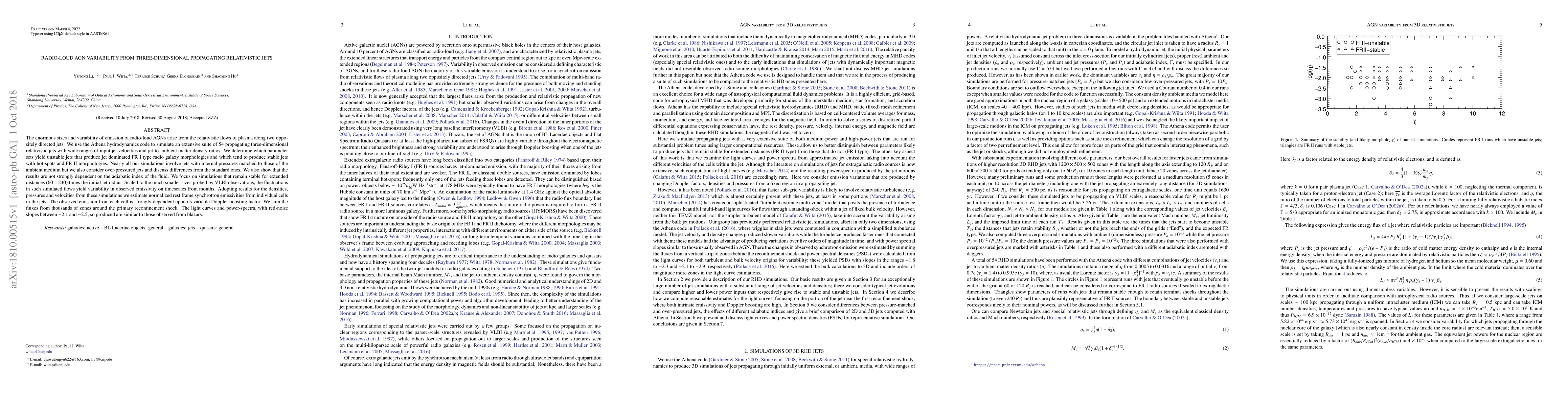 The enormous sizes and variability of emission of radio-loud AGNs arise from the relativistic flows of plasma along two oppositely directed jets. We use the Athena hydrodynamics code to simulate an extensive suite of 54 propagating three-dimensional relativistic jets with wide ranges of input jet velocities and jet-to-ambient matter density ratios. We determine which parameter sets yield unstable jets that produce jet dominated FR I type radio galaxy morphologies and which tend to produce stable jets with hot-spots and FR II morphologies. Nearly all our simulations involve jets with internal pressures matched to those of the ambient medium but we also consider over-pressured jets and discuss differences from the standard ones. We also show that the results are not strongly dependent on the adiabatic index of the fluid. We focus on simulations that remain stable for extended distances (60-240) times the initial jet radius. Scaled to the much smaller sizes probed by VLBI observations, the fluctuations in such simulated flows yield variability in observed emissivity on timescales from months. Adopting results for the densities, pressures and velocities from these simulations we estimate normalized rest frame synchrotron emissivities from individual cells in the jets. The observed emission from each cell is strongly dependent upon its variable Doppler boosting factor. We sum the fluxes from thousands of zones around the primary reconfinement shock. The light curves an power-spectra, with red-noise slopes between -2.1 and -2.5, so produced are similar to those observed from blazars.