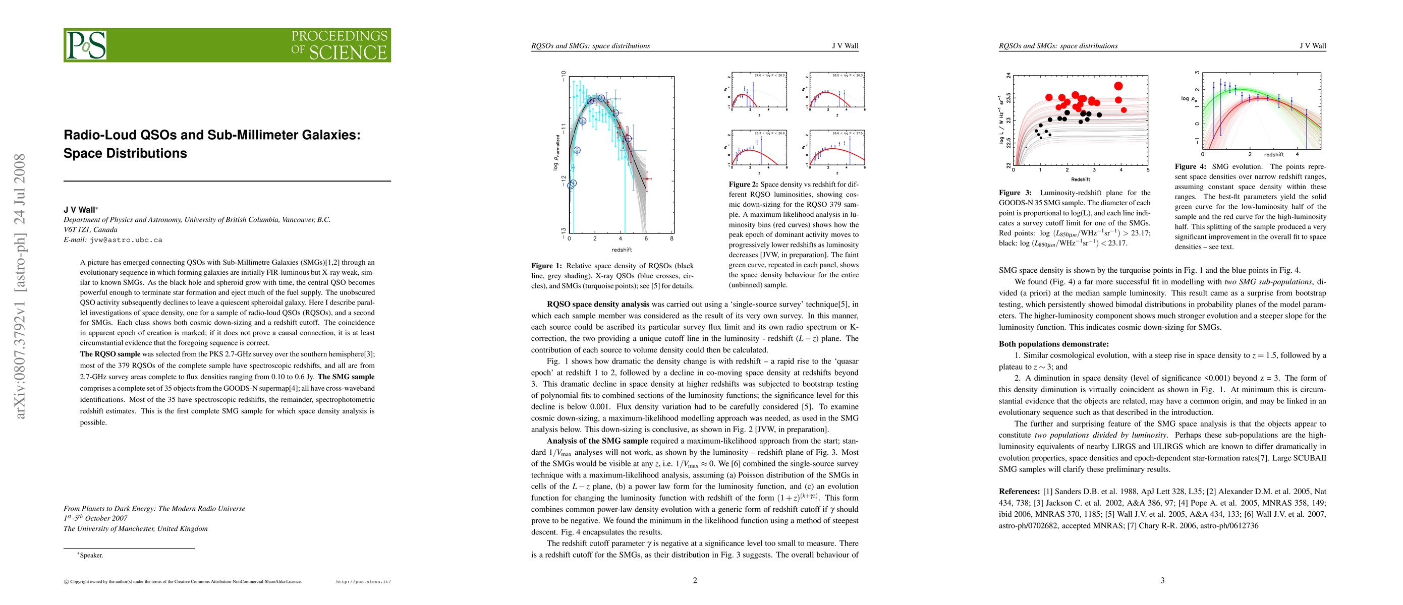A picture has emerged connecting QSOs with Sub-Millimetre Galaxies (SMGs) through an evolutionary sequence in which forming galaxies are initially FIR-luminous but X-ray weak, similar to known SMGs. As the black hole and spheroid grow with time, the central QSO becomes powerful enough to terminate star formation and eject much of the fuel supply. The unobscured QSO activity subsequently declines to leave a quiescent spheroidal galaxy. Here I describe parallel investigations of space density, one for a sample of radio-loud QSOs (RQSOs), and a second for SMGs. Each class shows both cosmic down-sizing and a redshift cutoff. The coincidence in apparent epoch of creation is marked; if it does not prove a causal connection, it is at least circumstantial evidence that the foregoing sequence is correct.