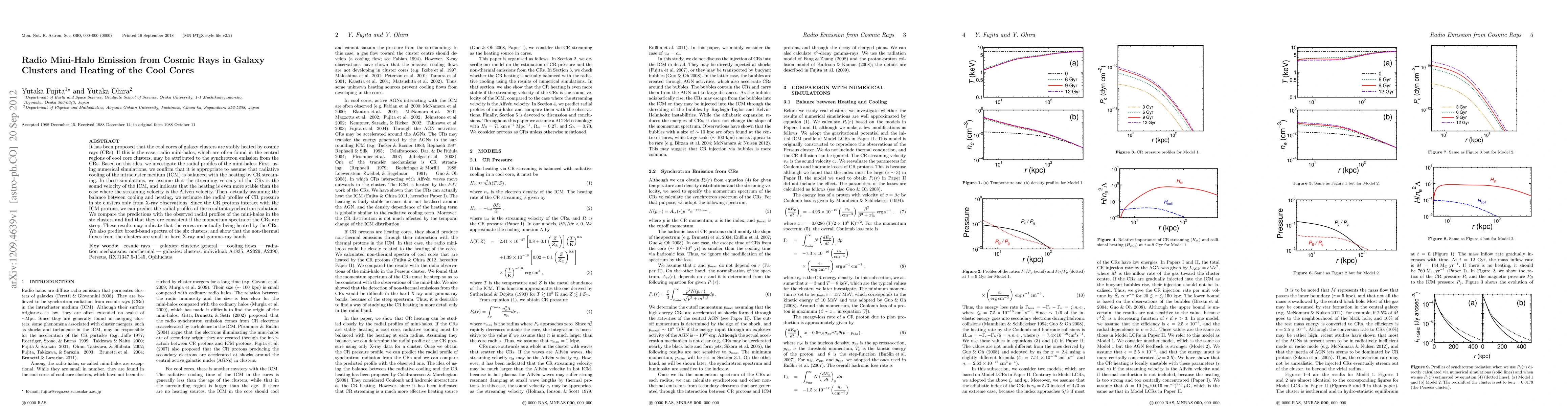 This paper investigates the heating of cool core galaxy clusters by cosmic rays (CRs) and the resulting synchrotron emission in radio mini-halos. Numerical simulations confirm the balance between radiative cooling and CR heating in the intracluster medium, predicting consistent radial profiles of mini-halos if CR momentum spectra are steep.