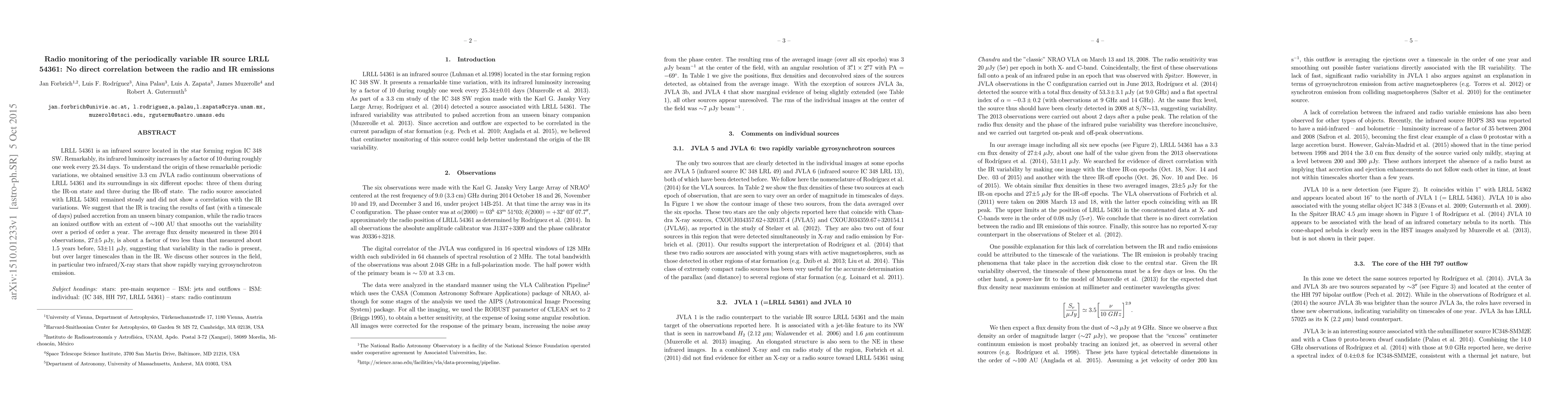 LRLL 54361 is an infrared source located in the star forming region IC 348 SW. Remarkably, its infrared luminosity increases by a factor of 10 during roughly one week every 25.34 days. To understand the origin of these remarkable periodic variations, we obtained sensitive 3.3 cm JVLA radio continuum observations of LRLL 54361 and its surroundings in six different epochs: three of them during the IR-on state and three during the IR-off state. The radio source associated with LRLL 54361 remained steady and did not show a correlation with the IR variations. We suggest that the IR is tracing the results of fast (with a timescale of days) pulsed accretion from an unseen binary companion, while the radio traces an ionized outflow with an extent of $\sim$100 AU that smooths out the variability over a period of order a year. The average flux density measured in these 2014 observations, 27$\pm$5 $\mu$Jy, is about a factor of two less than that measured about 1.5 years before, $53\pm$11 $\mu$Jy, suggesting that variability in the radio is present, but over larger timescales than in the IR. We discuss other sources in the field, in particular two infrared/X-ray stars that show rapidly varying gyrosynchrotron emission.