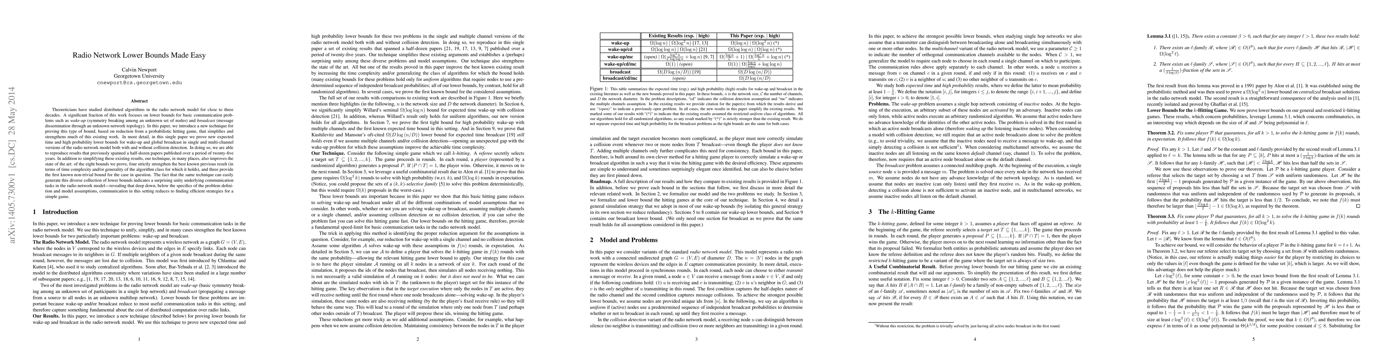 Theoreticians have studied distributed algorithms in the radio network model for close to three decades. A significant fraction of this work focuses on lower bounds for basic communication problems such as wake-up (symmetry breaking among an unknown set of nodes) and broadcast (message dissemination through an unknown network topology). In this paper, we introduce a new technique for proving this type of bound, based on reduction from a probabilistic hitting game, that simplifies and strengthens much of this existing work. In more detail, in this single paper we prove new expected time and high probability lower bounds for wake-up and global broadcast in single and multichannel versions of the radio network model both with and without collision detection. In doing so, we are able to reproduce results that previously spanned a half-dozen papers published over a period of twenty-five years. In addition to simplifying these existing results, our technique, in many places, also improves the state of the art: of the eight bounds we prove, four strictly strengthen the best known previous result (in terms of time complexity and/or generality of the algorithm class for which it holds), and three provide the first known non-trivial bound for the case in question. The fact that the same technique can easily generate this diverse collection of lower bounds indicates a surprising unity underlying communication tasks in the radio network model---revealing that deep down, below the specifics of the problem definition and model assumptions, communication in this setting reduces to finding efficient strategies for a simple game.