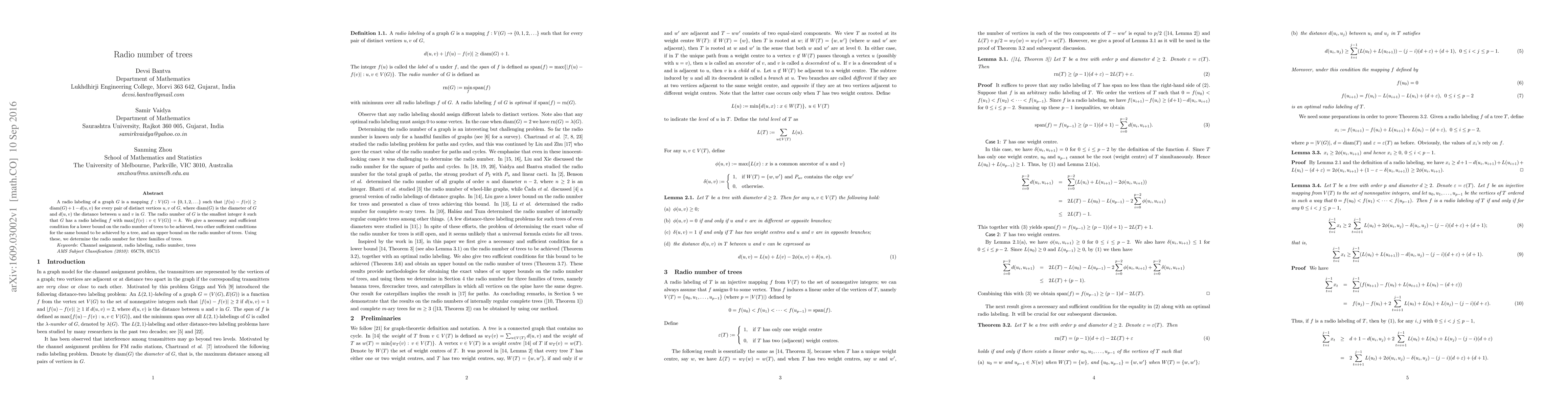 A radio labeling of a graph $G$ is a mapping $f: V(G) \rightarrow \{0, 1, 2, \ldots\}$ such that $|f(u)-f(v)|\geq d + 1 - d(u,v)$ for every pair of distinct vertices $u, v$ of $G$, where $d$ is the diameter of $G$ and $d(u,v)$ the distance between $u$ and $v$ in $G$. The radio number of $G$ is the smallest integer $k$ such that $G$ has a radio labeling $f$ with $\max\{f(v) : v \in V(G)\} = k$. We give a necessary and sufficient condition for a lower bound on the radio number of trees to be achieved, two other sufficient conditions for the same bound to be achieved by a tree, and an upper bound on the radio number of trees. Using these, we determine the radio number for three families of trees.